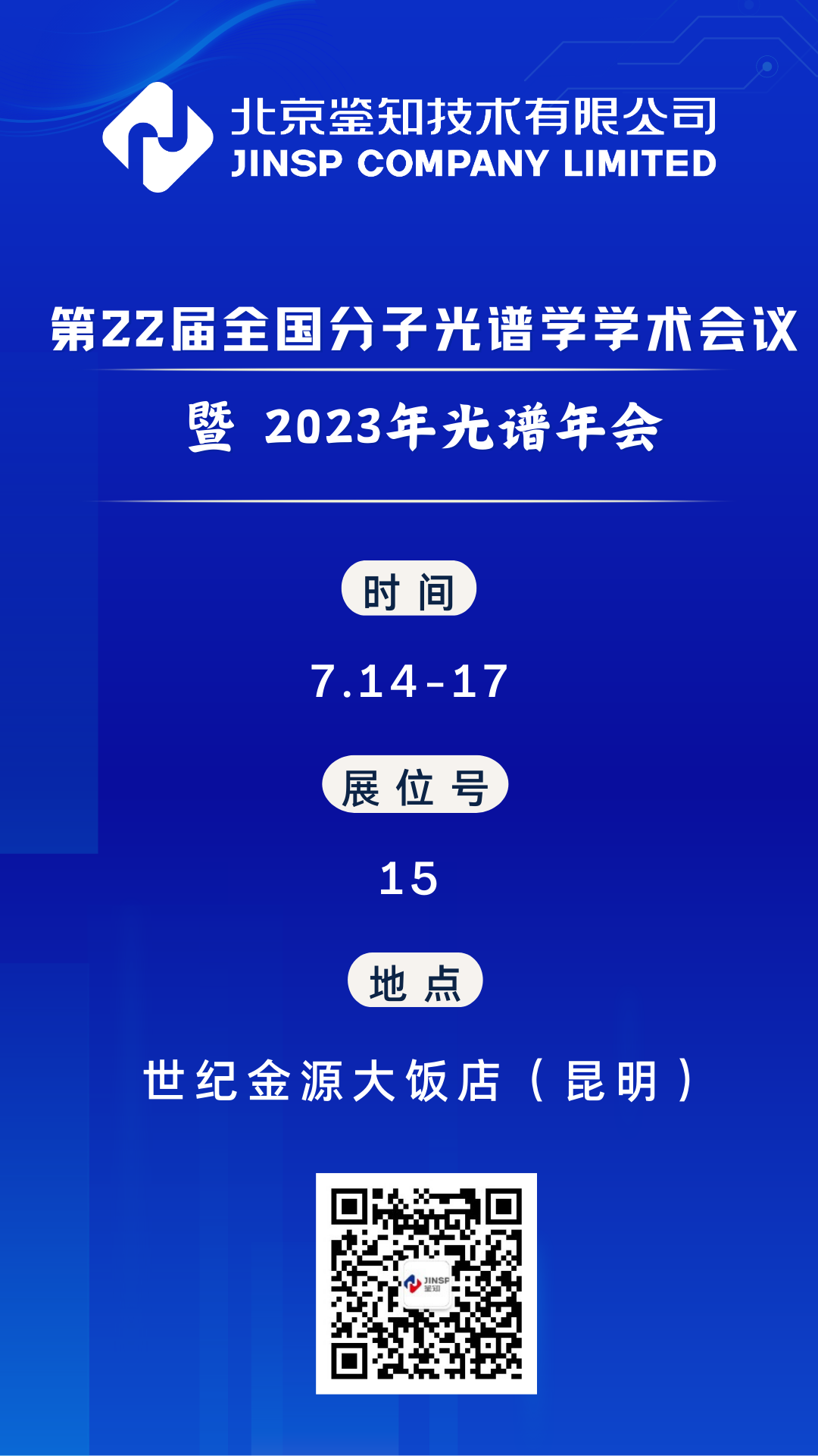 2023年7月14-17号,第22届全国分子光谱学学术会议暨2023年光谱年会将在云南昆明,世纪金源大饭店举行,鉴知技术诚邀各位业内同仁届时莅临洽谈。