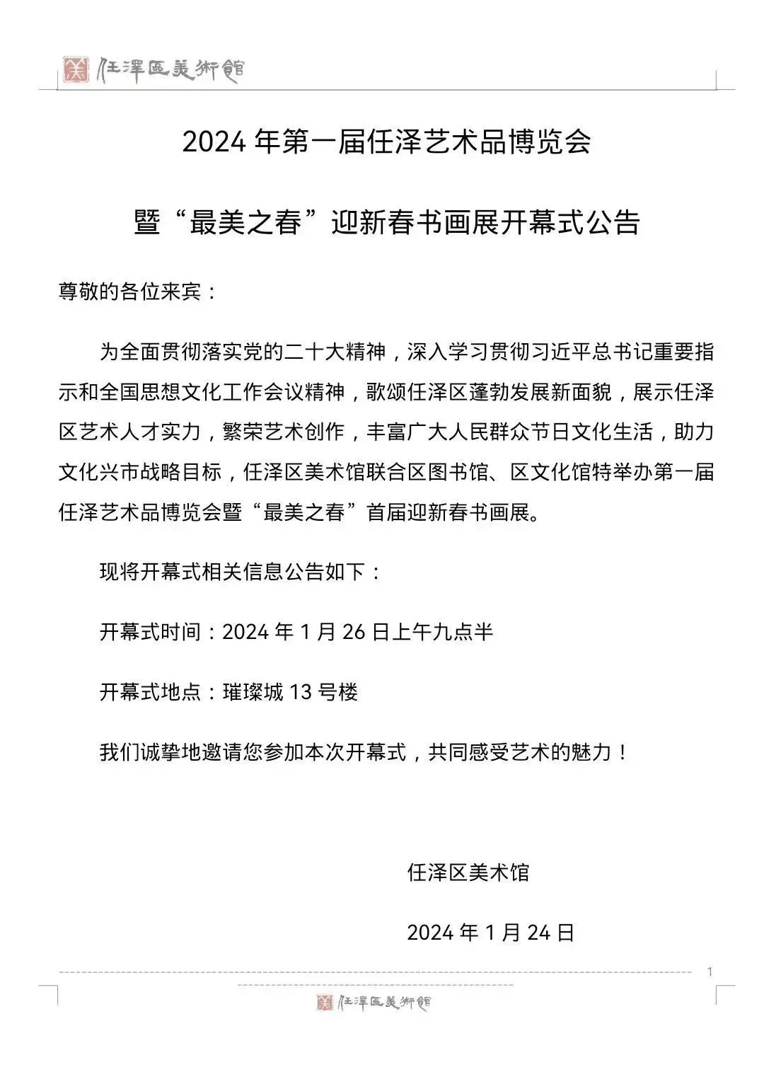 2024 年第一届任泽艺术品博览会暨“最美之春”迎新春书画展开幕式公告