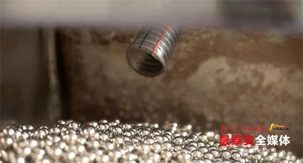 一根细长的钢丝经过机器拔丝拉伸,成功“瘦身”为直径接近2.5毫米的线材,随后线材经过钢球冷镦机锻打成球胚,球胚经过光磨、淬火、初研、精研等十几道工序,变成一颗颗晶亮光滑、直径仅2.5毫米的钢球。
