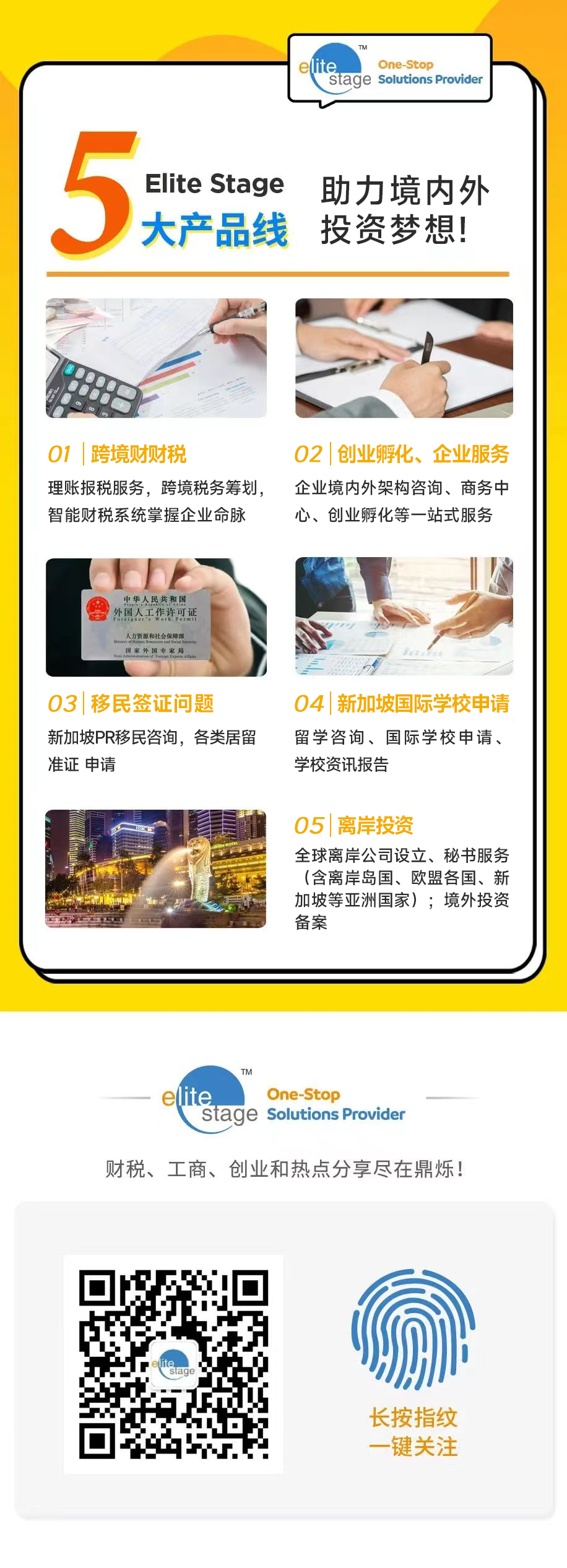 Elite Stage咨询机构拥有十余年投资经验,和专业的国际团队,丰富的行业经验和广泛的社会商业资源,为本地及海外客户提供一站式离岸投资服务,例如跨境架构、外汇备案、会计记账、税务申报、本地银行、商务中心、家族办公室等。如需搭建新加坡 等离岸框架及其他服务, 欢迎联系我们!