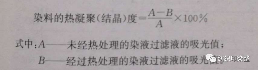 ③分散染料的分散液,在高温(>100℃)热处理的过程中,水中的染料,即会凝聚成大的聚集体,又会通过晶体扩大和二次结晶,产生大的染料晶体。因此,测得的染料热凝聚度,实际是染料的凝聚程度与结晶程度的综合参数。