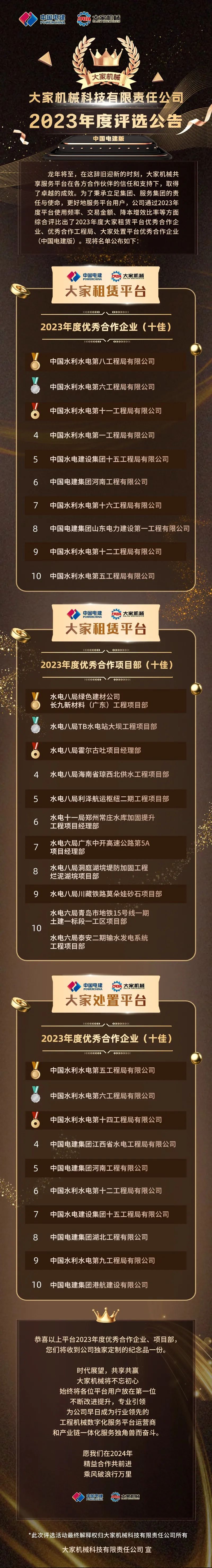 【重要公告】大家机械科技公司2023年度优秀合作企业、项目部(十佳)评选公告