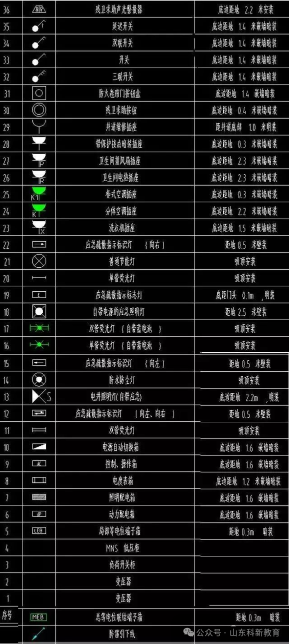 建筑电气图例中,插座的分类一般用字母来代替,比如普通插座旁多了一个字母R,则用来表示热水器插座。上图中,左边图例,右边为相对应的安装高度。