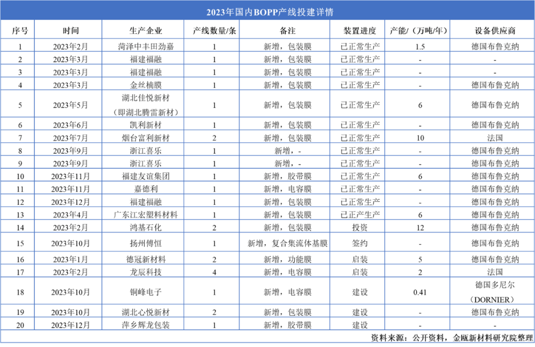 金瓯新材料研究院不完全统计数据显示,2023年国内共计建设BOPP薄膜产线27条,其中用于包装、胶带领域的BOPP产线共计20条,为主要投资方向。同时,2023年,扬州傅恒投资国内首条同步拉伸BOPP复合集流体基膜项目,助力国内复合集流体批量化应用。