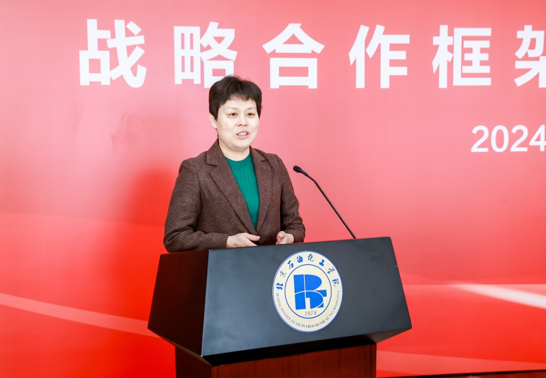 刘颖代表学校党委对陈宇董事长一行来访表示热烈欢迎,向双方携手签约表示诚挚祝贺。她表示,北京化工集团秉承化工优良传统,发挥化工专业优势,专注于应用市场,真抓实干,为首都经济社会发展作出卓越贡献。我校与北京化工集团有着深厚的合作基础和紧密的合作对接点,同为服务新时代首都发展的重要力量,同担职责使命,同解高质量发展难题,这是双方实现可持续发展、共谋共赢点的基础所在。2023年,我校立足办学定位和办学特色,在学科建设、教学科研等方面取得了丰硕的实践成果。本次合作是双方优势互补、共赋发展的新篇章,也是学校高水平应用型大学建设的新起点。学校将贯彻落实习近平总书记在“国家工程师奖”首次评选表彰之际作出的重要指示精神,发挥教育科技人才资源优势,清单化项目化推动合作任务落实,共同建设都市化工安全现代产业学院和都市产业创新研究院,推动高水平科技成果产出和转化,提高应用型人才培养质量,为服务北京“四个中心”功能建设和高精尖产业发展,保障首都城市安全运行作出新的更大贡献。