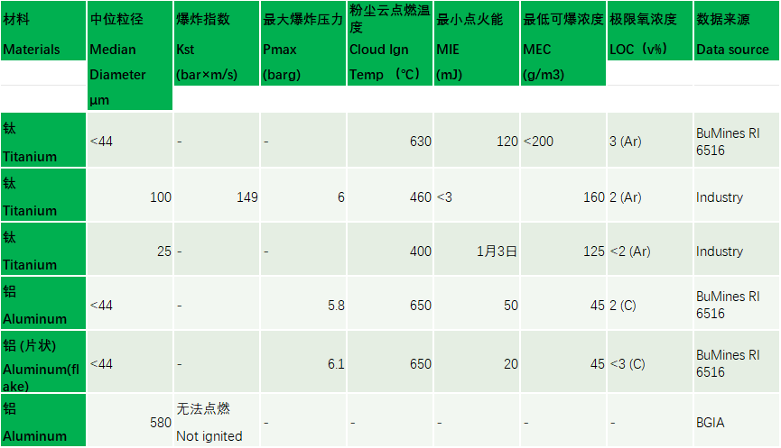 不同粒径下钛粉及铝粉的典型燃爆参数 (来源NFPA 652)