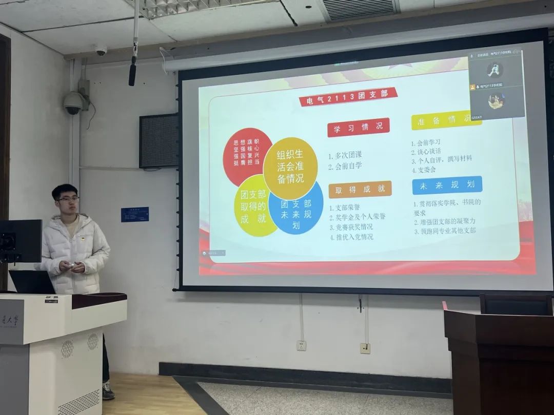 团支书李宏阳在年度专题组织生活会上对团支部的工作情况进行了详细的汇报。首先是组织生活会准备情况,为确保本次组织生活会的顺利进行,团支部成员积极参与了会前学习,进行了密切的谈心谈话。随后李宏阳总结了支部获得的成就体现了团员们的政治觉悟和责任担当。最后他鼓舞电气2113团支部,努力成为同专业其他支部的榜样和领头羊,积极引领团队成员在学术、科研和社会服务等方面取得更多的成就。