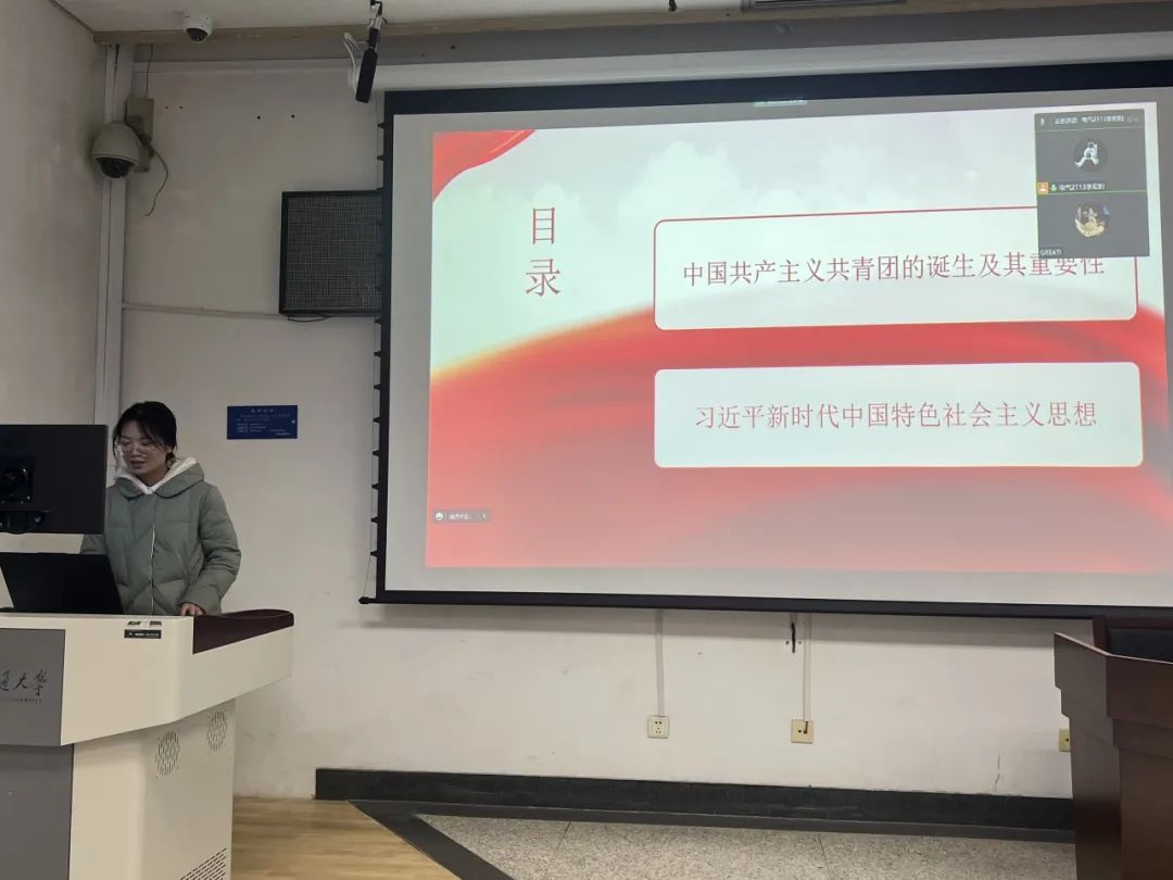 电气2113团支部副书记李泽媛进行的团课宣讲是电气2113团支部年度专题组织生活会中的关键环节。她深刻阐述了“切实肩负新时代新征程的使命任务”的内涵和重要性。李泽媛首先回顾了中国共产主义共青团的诞生历程,指出共青团的使命不仅是关心和服务青年群体,更要积极响应党的号召。李泽媛还深入介绍了习近平新时代中国特色社会主义思想的核心内容和历史背景。她强调,这一思想是中国特色社会主义发展的重要指导思想,也是新时代中国青年肩负的伟大历史使命的科学指南。
