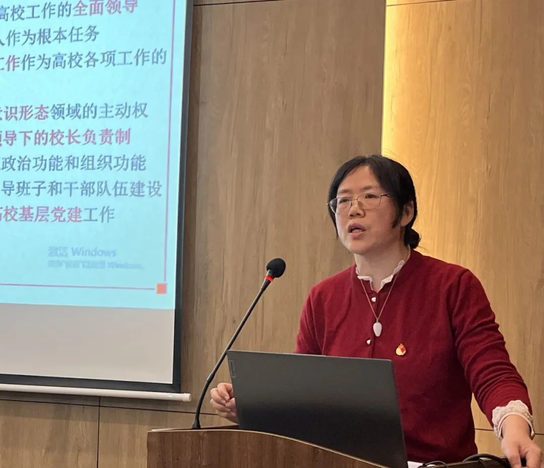 首先,田卫平作了《增强党支部政治功能与组织功能 推动党建与事业深度融合》专题报告。她提纲挈领地解读了新时代党的建设总要求,阐释了学校基层组织工作重要性并介绍学校党建双创情况,并围绕学院党建项目今后努力方向给出了建议。