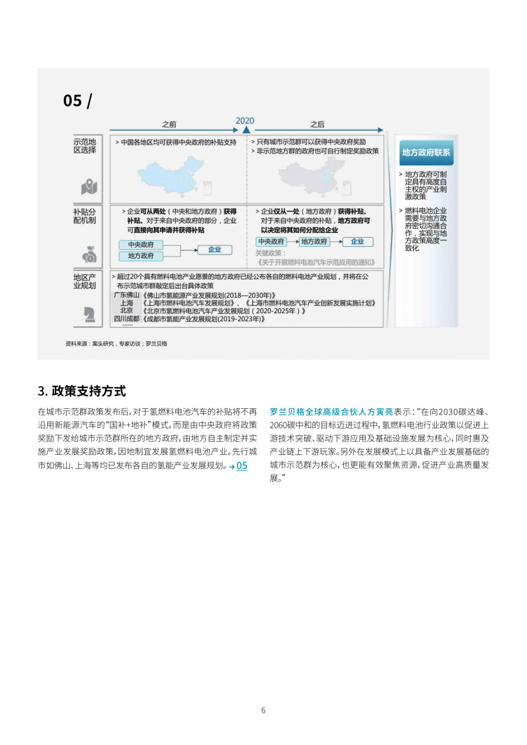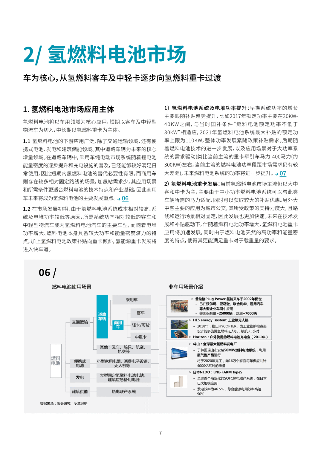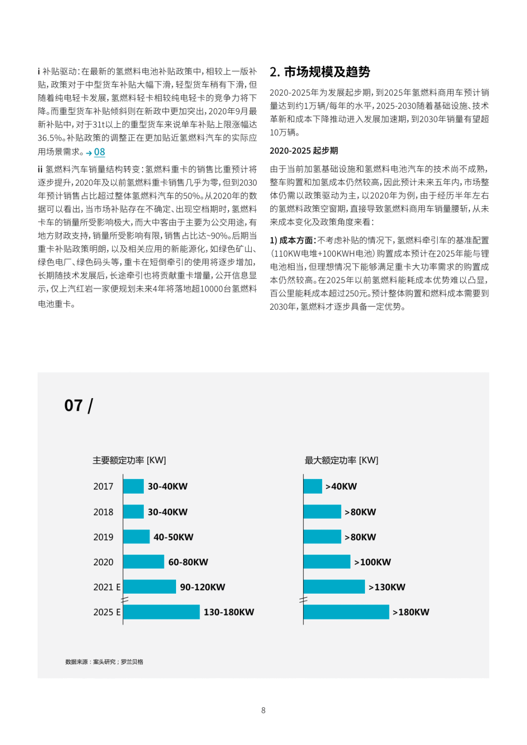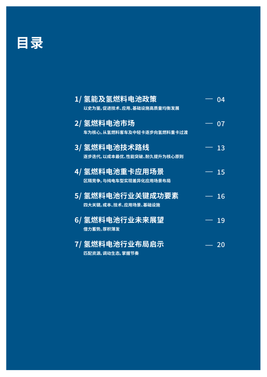 2021,罗兰贝格发布《中国氢燃料电池重卡行业发展白皮书》,本次报告共分为七个部分,分别从氢能及氢燃料电池政策、氢燃料电池市场、氢燃料电池技术路线、氢燃料电池应用场景、氢燃料电池行业关键成功要素、氢燃料电池行业未来展望以及氢燃料电池行业布局启示全面剖析中国氢燃料电池行业发展。
