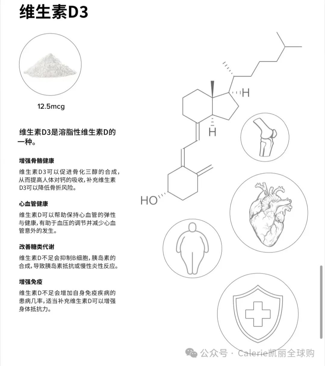 4)维生素D3(12.5mcg/袋):是溶脂性维生素D的一种。主要功效:增强骨骼健康、心血管健康、改善糖类代谢、增强免疫。