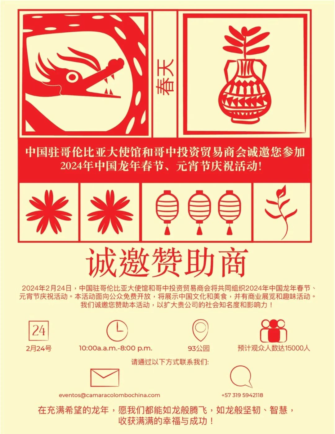 尊敬的在哥各界友人,大家好!2024年中国龙年春节即将来临,为了和大家一起辞旧迎新,共享中国年的喜庆欢乐,中国驻哥伦比亚大使馆于2月24日特别举办2024年中国龙年春节元宵节特别庆祝活动,欢迎大家参加。