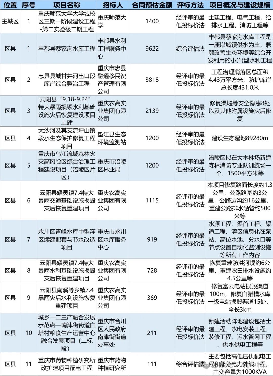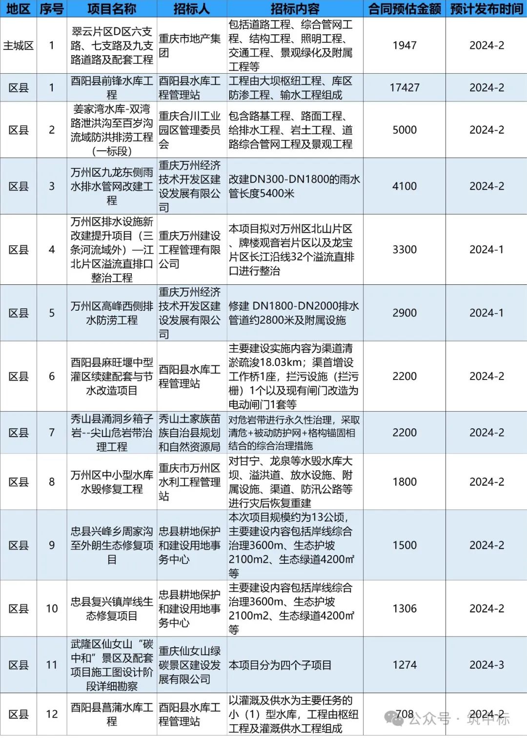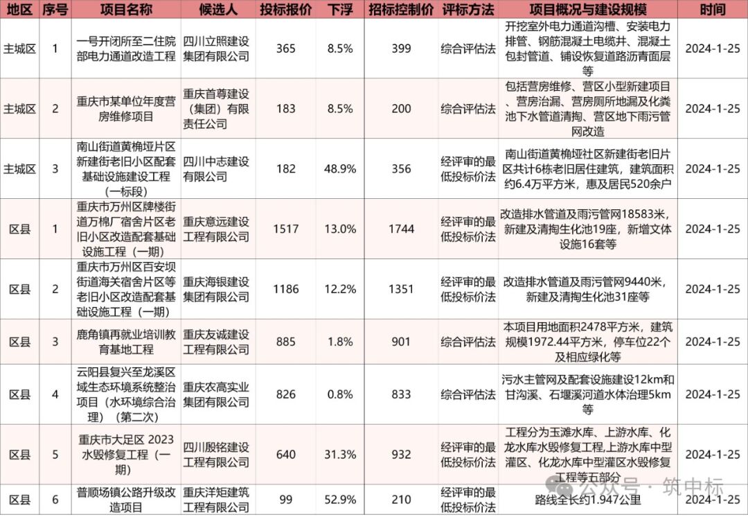 今天是2024年1月26日,下面是最新的工程建设类招标计划简讯,招标计划全市总计13条,主城区1条,周边区县12条。项目合同预估金额大于1亿的有1个,主城区0个,区县1个。1000万-1亿的有11个,主城区1个,区县10个。下面是最新的工程建设类招标公告简讯,招标公告信息全市总计12条,主城区1条,周边区县11条。项目合同预估金额大于1亿的有0个,主城区0个,区县0个。1000万-1亿的有7个,主城区1个,区县6个。其中采用“综合评估法”的项目有2个,采用“经评审的最低价投标法”的项目有10个。下面是最新的工程建设类中标候选人公示简讯,中标候选人公示信息全市总计9条,主城区3条,周边区县6条。