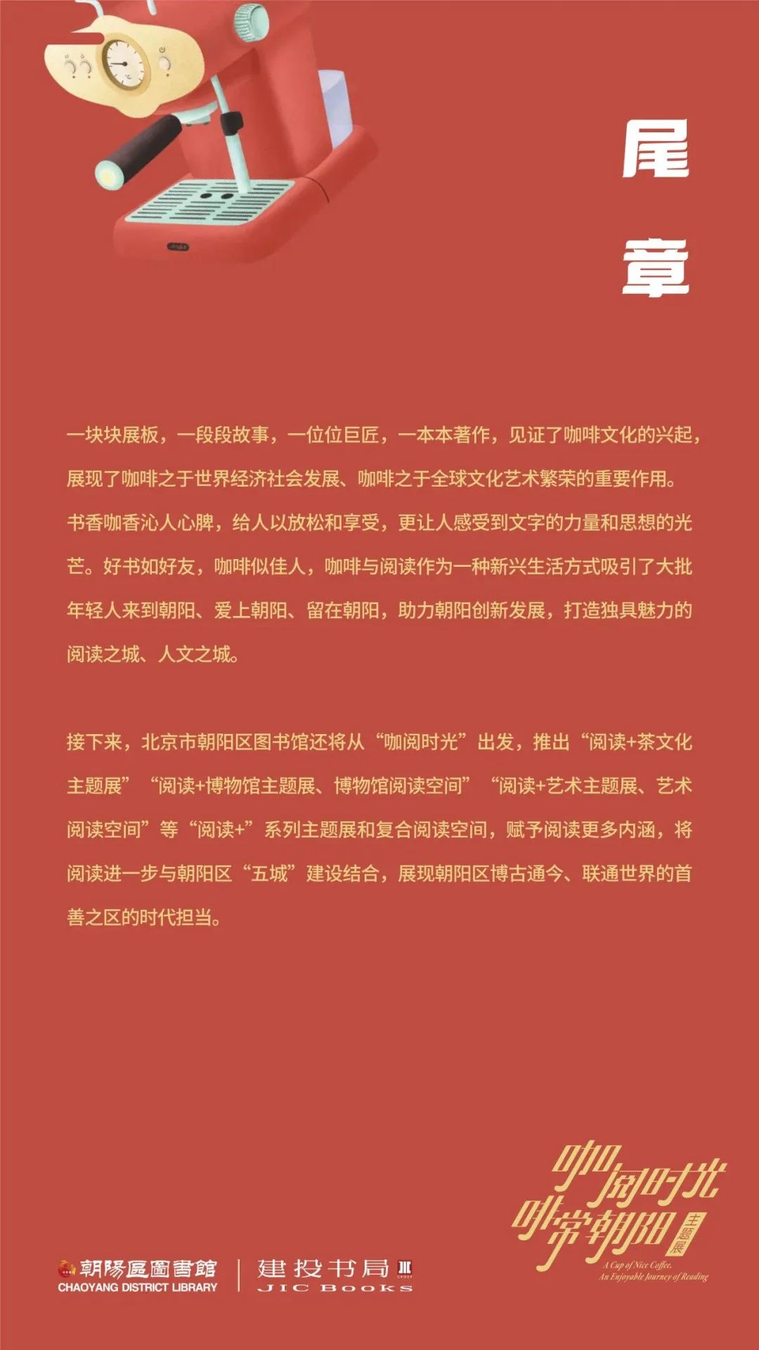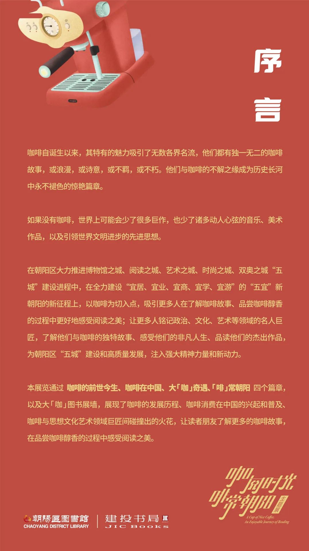 2024年1月19日,朝阳区图书馆联合建投书局特别策划的“咖阅时光 啡常朝阳”主题展览活动于朝阳区图书馆劲松馆一层大厅正式亮相。展览以咖啡为切入点,通过“咖啡的前世今生”“咖啡在中国”“大‘咖’奇遇”“啡常朝阳”四个篇章,以及大“咖”图书展墙,展现了咖啡的发展历程、咖啡消费在中国的兴起和普及、咖啡与思想文化艺术领域巨匠间碰撞出的火花。