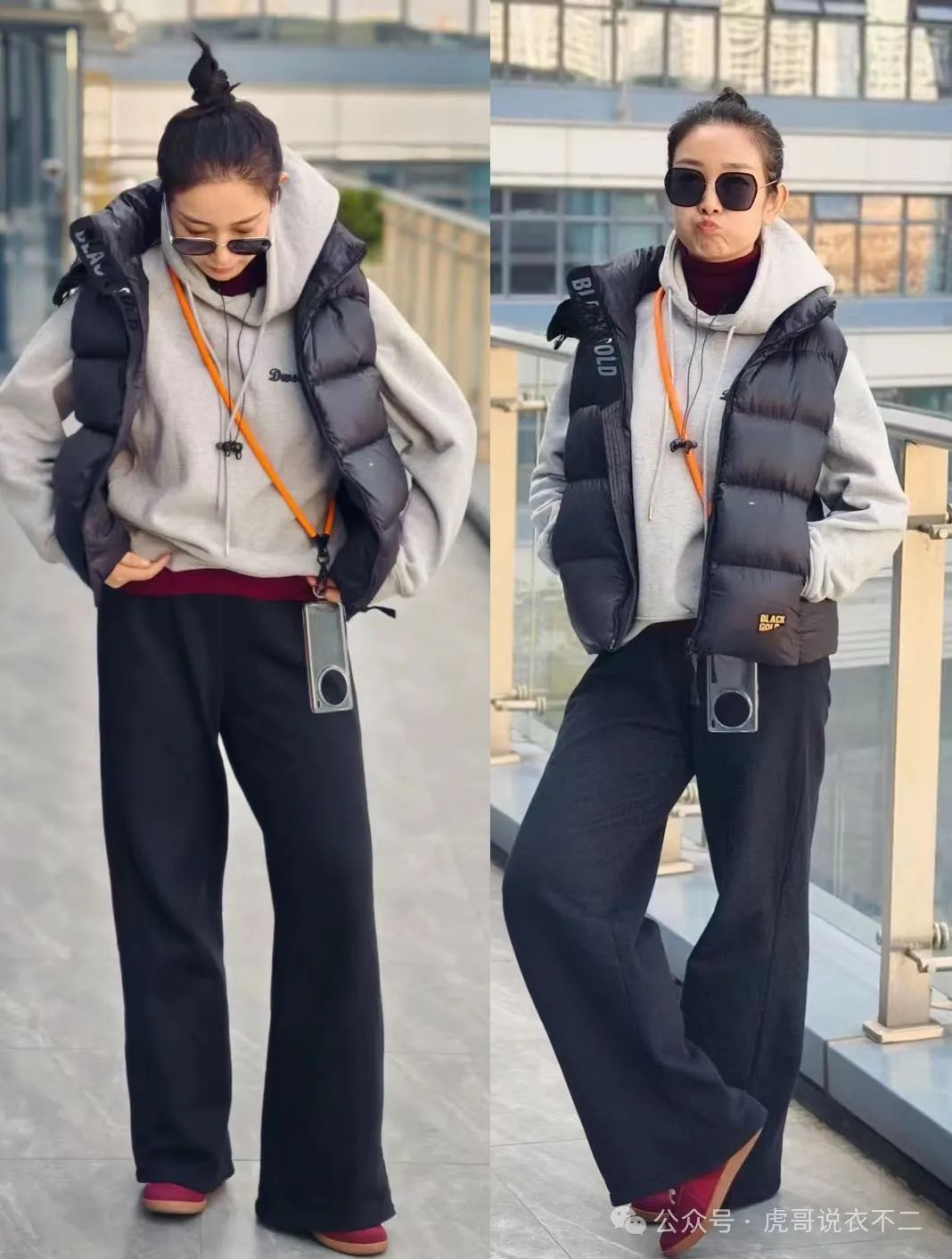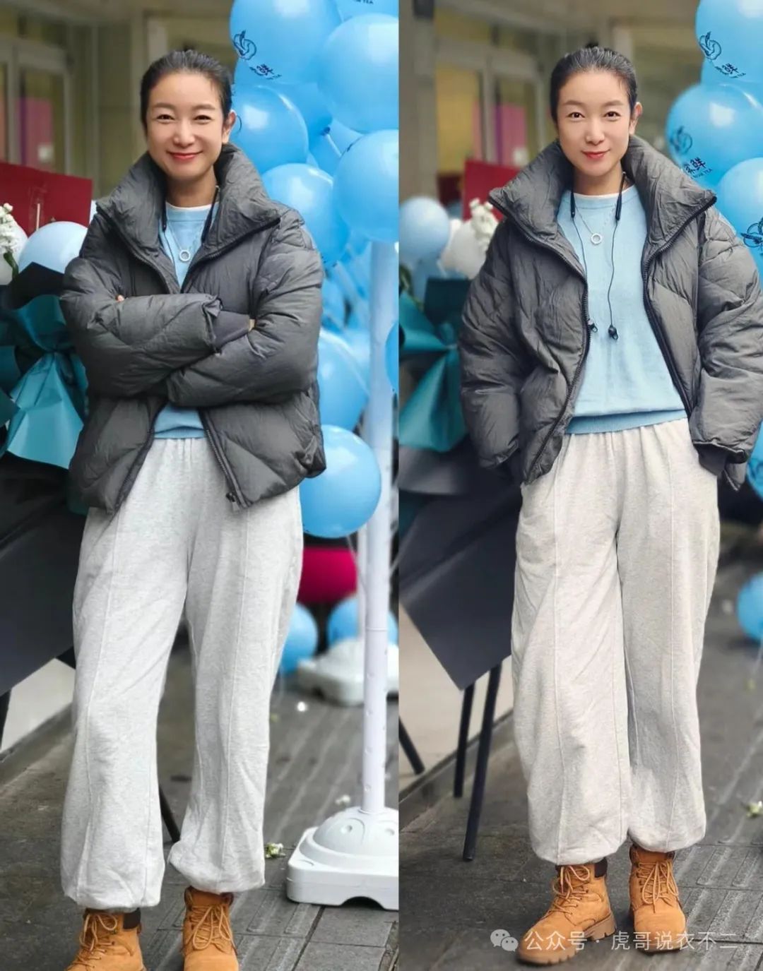 上装选用深灰色羽绒服进行搭配时,上下装就可以在形成鲜明层次感的同时,又能不经意的产生几分呼应感,来实现更加富有整体感的视觉风格。