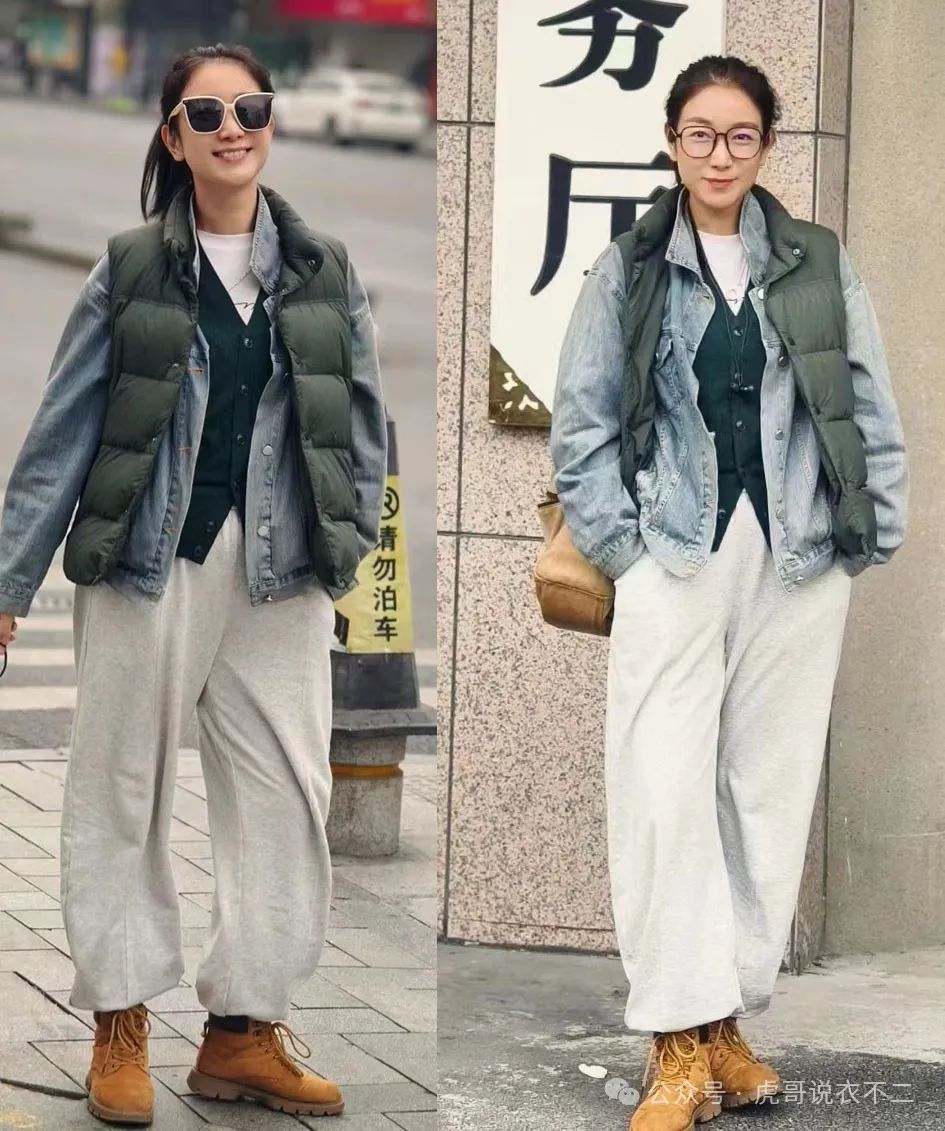 图中这位女士就简单的应用了几款常见的基础款上装,其中红色开衫的加入,巧妙地提升了视觉上的时尚氛围,但是在白色打底与黑色羽绒服的中和下,又不会显得过于跳脱,依旧是中年女人可以毫无压力驾驭的穿搭。