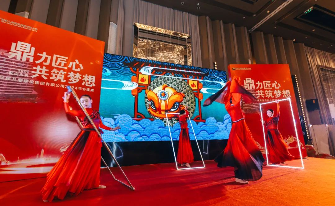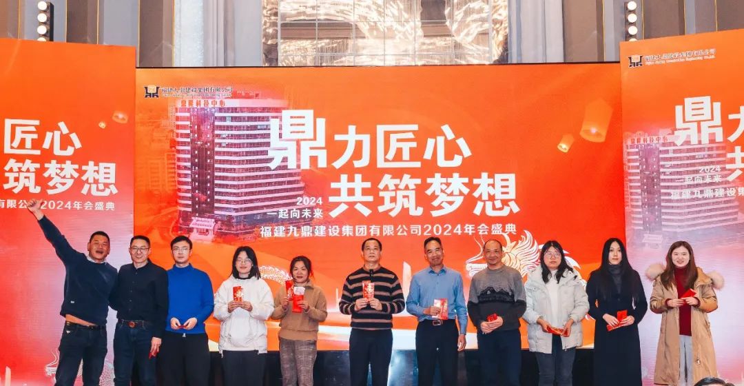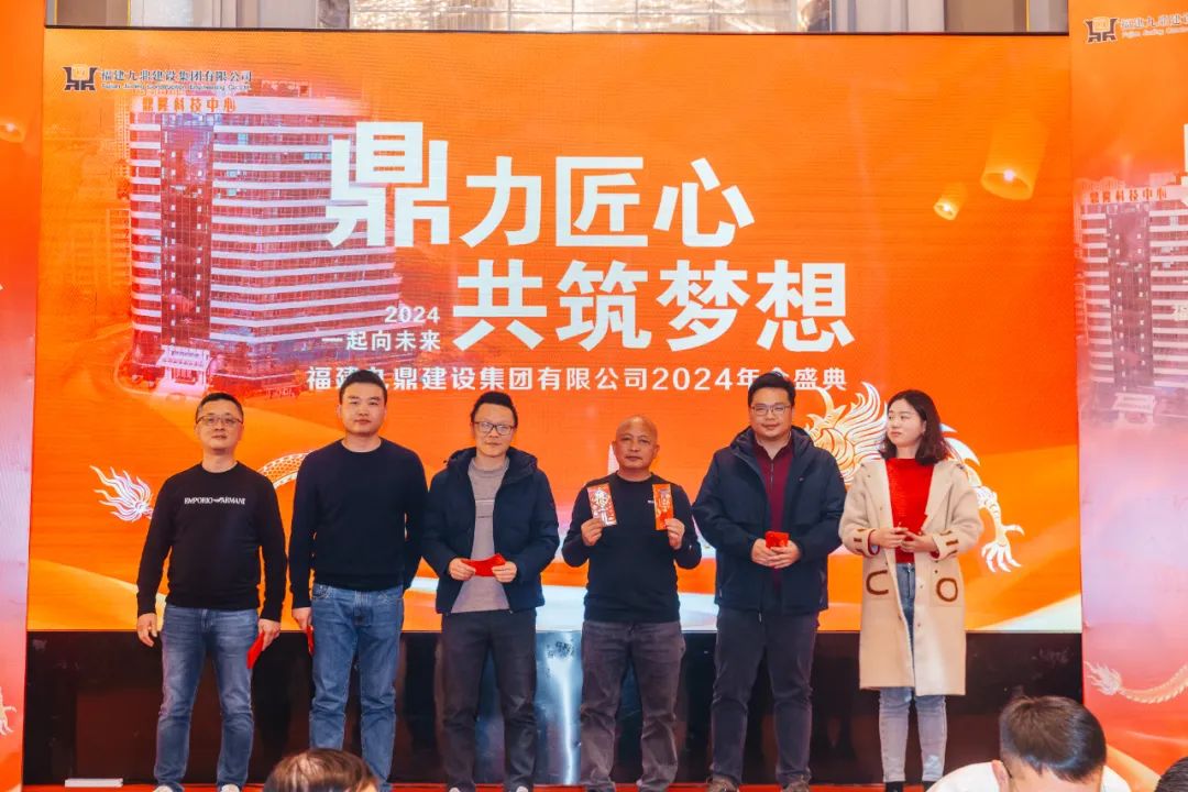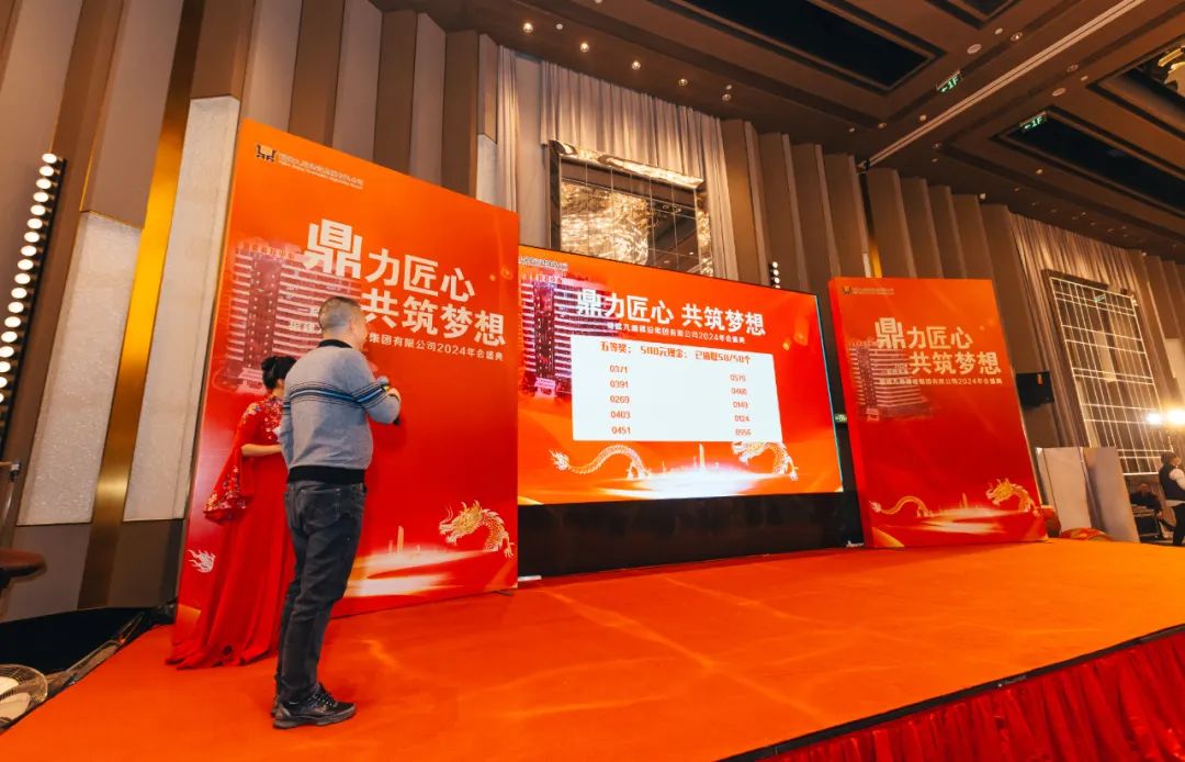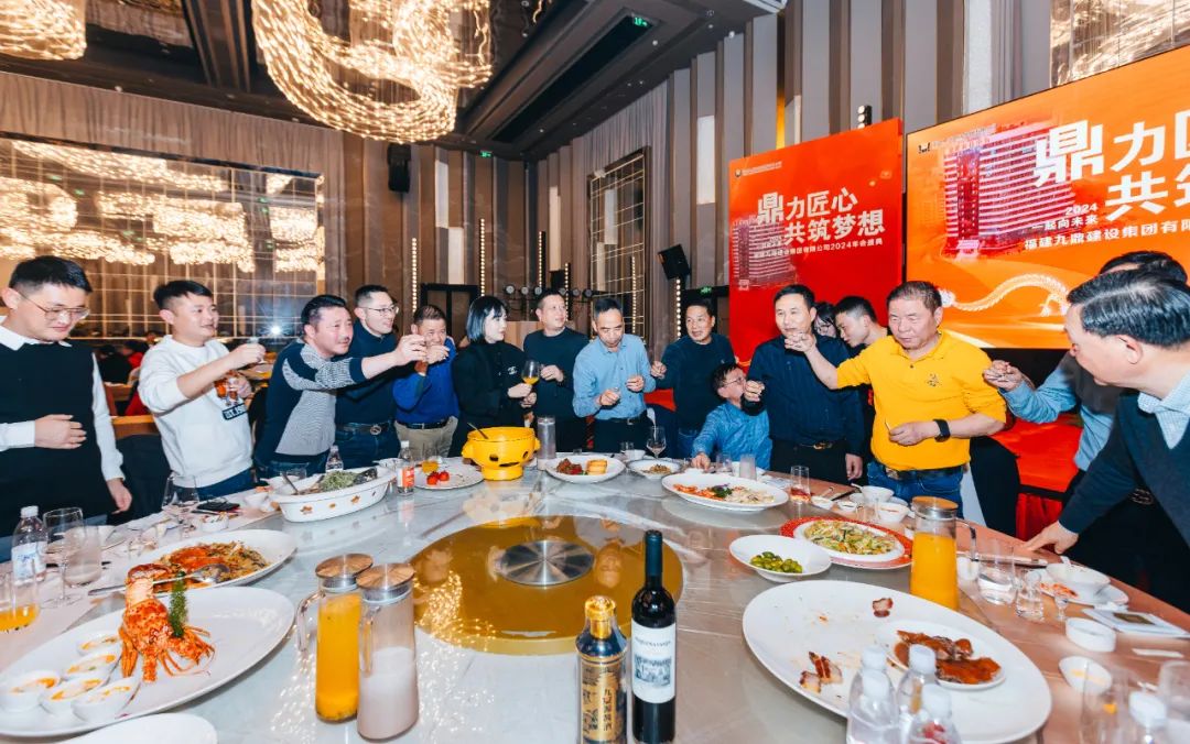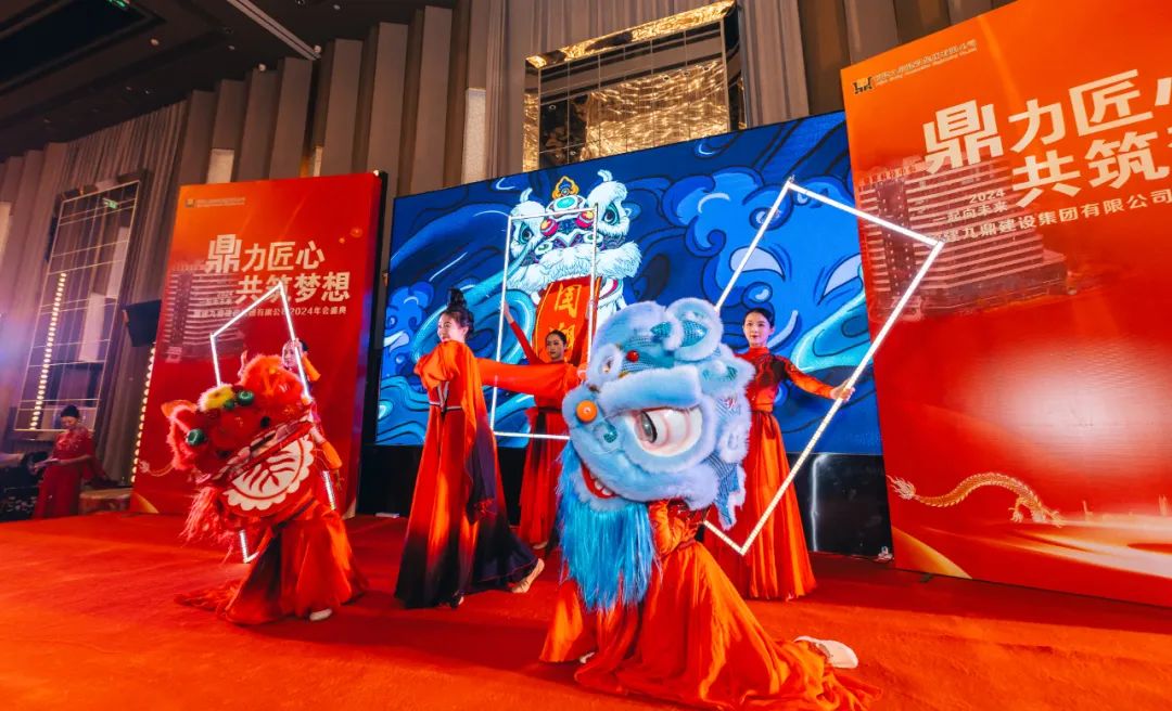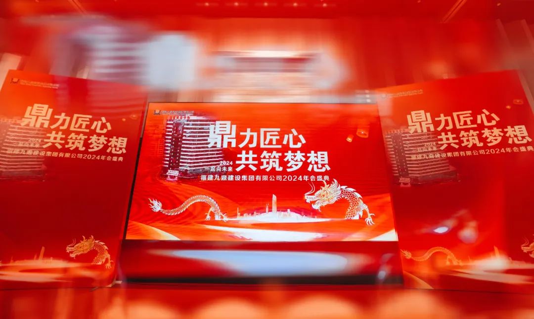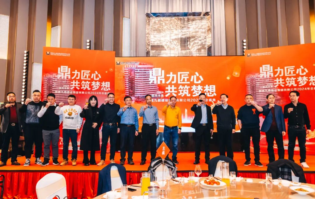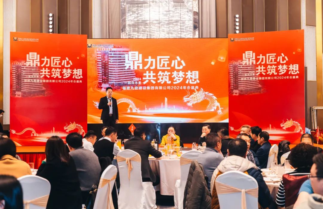 龙腾盛世,瑞气盈门!2024年1月25日,福州“悦港琴湾-福宴”望舒厅内张灯结彩,喜气洋洋,以“鼎力匠心,共筑梦想”为主题的福建九鼎建设集团有限公司2024年会盛典在这里隆重举行。九鼎集团、合龙建工、昆鼎建设、中科设计、闽清一建、九鼎源科技等六家企业近600人共襄盛典。现场洋溢着热情欢乐的氛围,各界人士济济一堂,畅叙发展,共享喜悦,共同谋划新的一年。