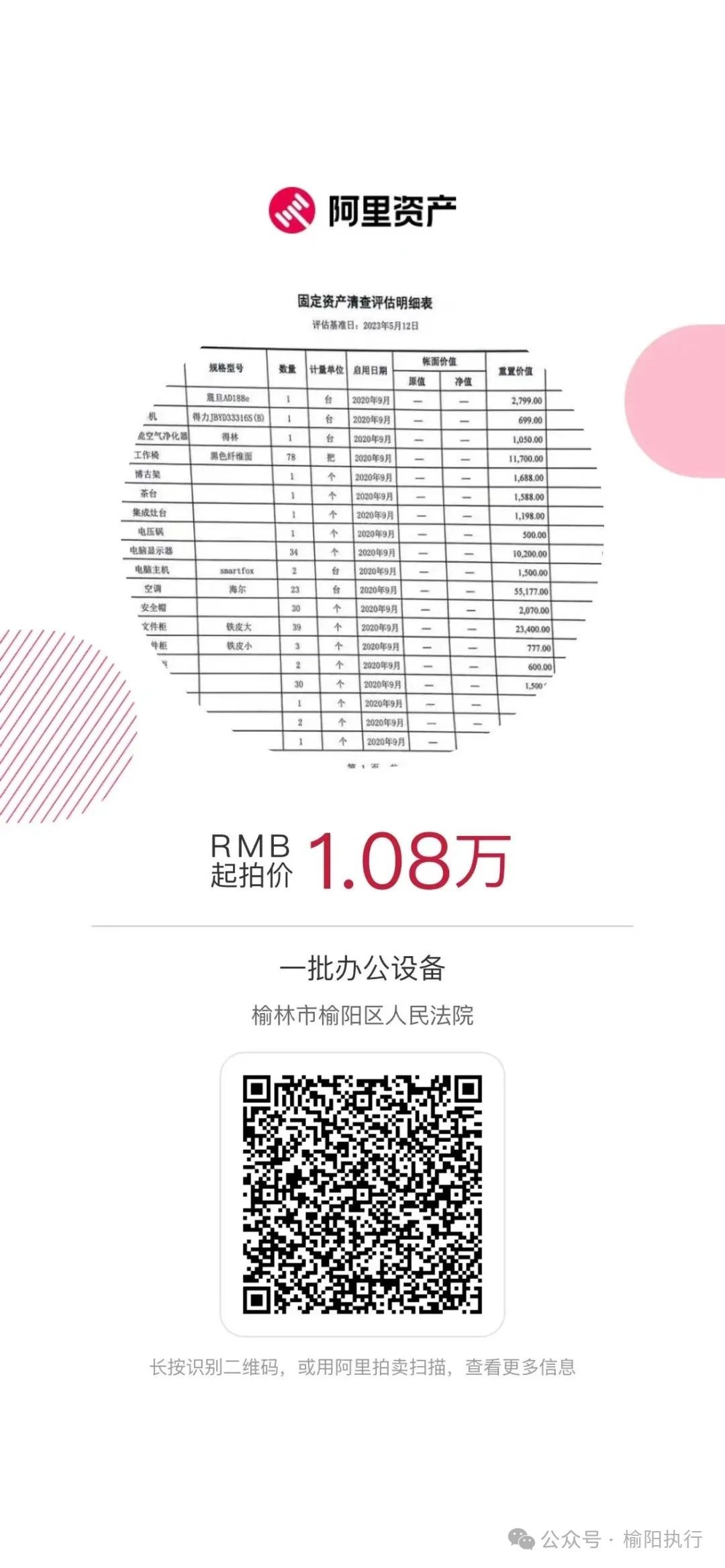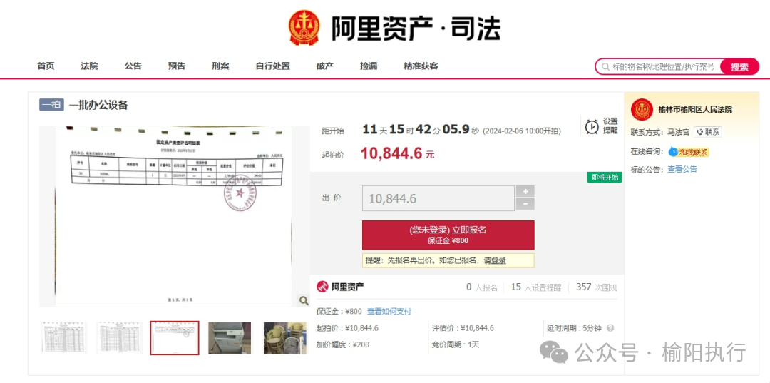 拍卖标的:一批办公设备(参考评估报告清单),权利人为宫百昌,设备现存放于榆林市公安局榆阳分局,本次拍卖起拍价为委托评估。