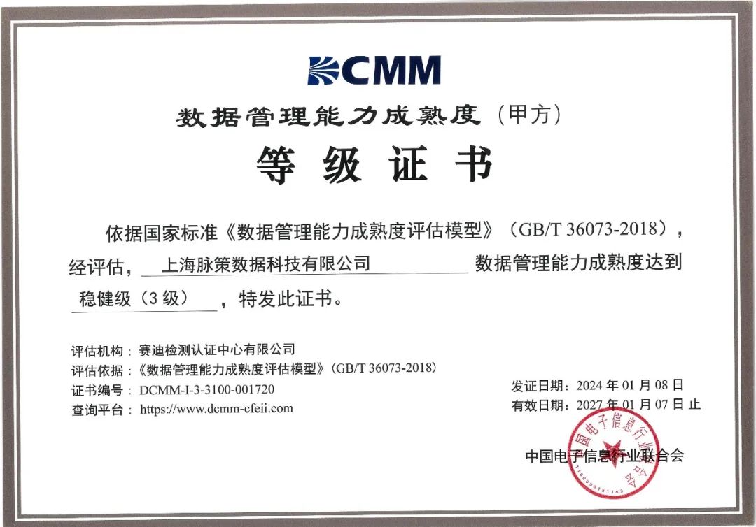 近日,中国电子信息行业联合会公布获得数据管理能力成熟度(DCMM)等级单位的名单,上海脉策数据科技有限公司获得DCMM甲方3级(稳健级)认证,标志着脉策数据管理能力已达到规范化标准。