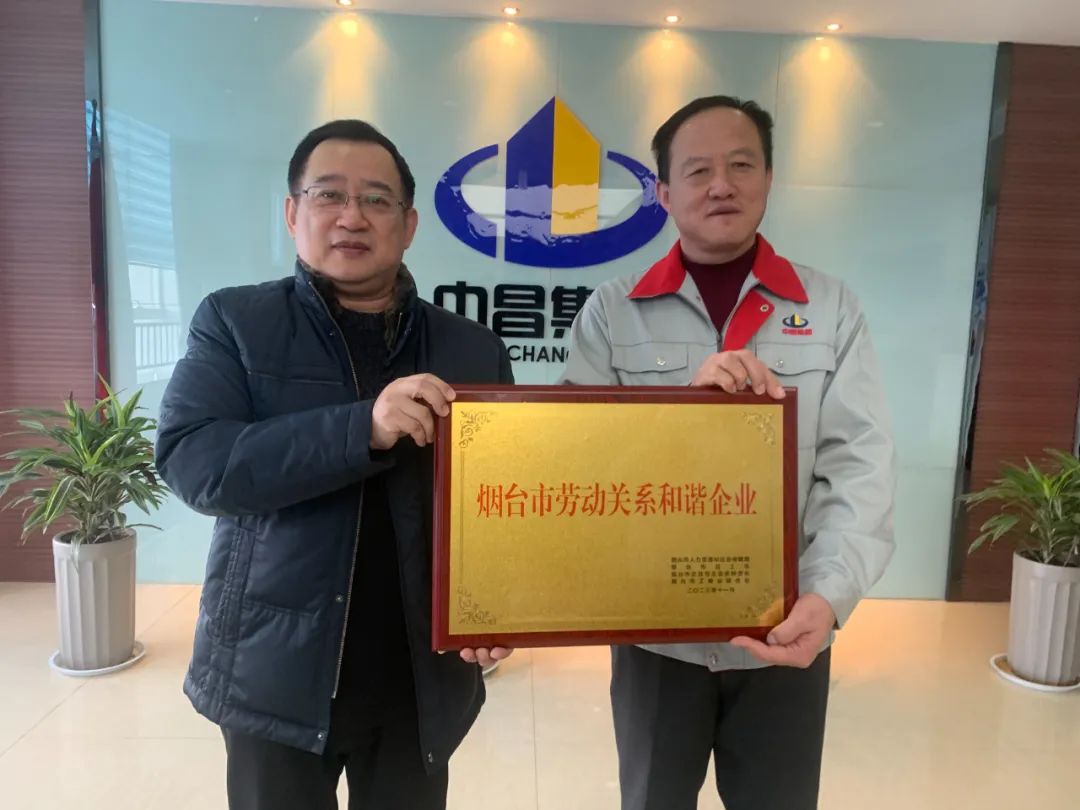 日前,市人社局、市总工会、市工商联领导一行来到中昌集团,为中昌集团“烟台市劳动关系和谐企业”荣誉授牌并就企业劳资问题展开座谈。
