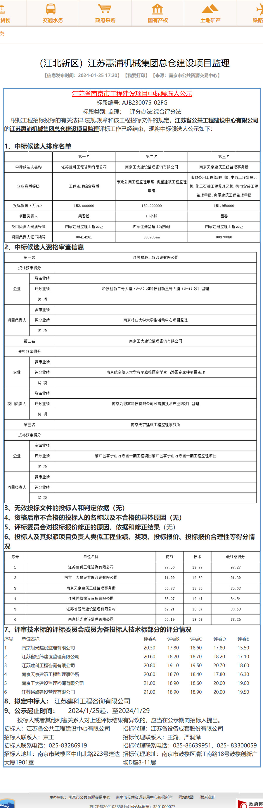 中标候选人公示 | 江苏惠浦机械集团总仓建设项目监理
