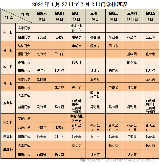 为了更好地方便广大患者朋友们,现将浮山县医疗集团人民医院1月27日——2月2日门诊坐诊医生排班表告知大家。