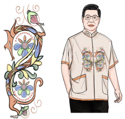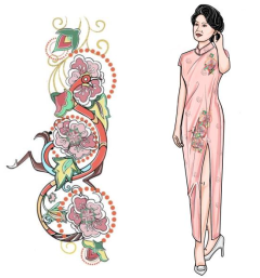 在亲朋好友的聚会和正式的宴会上,旗袍是中老年女性最青睐的服装款式[16]。楚凤纹样以刺绣的方式呈现在旗袍上,不仅可以完美地表达中国女性身上的东方韵味,还可以展现纹样的独特之处(图12)。节日里的旗袍应当尽量选择喜庆鲜艳的色彩,像素净的粉红旗袍就是不错的选择,能够彰显东方女性的端庄美。男士的礼服多以唐装为主,提取“一凤斗二龙一虎纹绣”中龙的形象应用到服装上,既秉承了中国传统中龙的文化韵味又能展现楚纹样的魅力(图13)。在色彩上,以咖啡色为主,蓝色、黄色、绿色等邻近色为辅,用以缓和对比,衬托出愉悦的精神面貌。