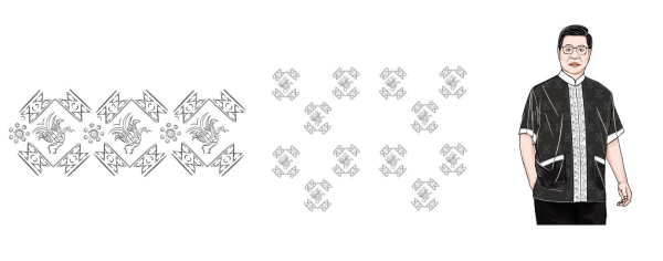 经过对凤鸟纹样布局形式的总结,可以发现整体呈现出长条状、较为规整的菱形内填式及缠绕组合式的纹样可以放置在服装的细节处(衣领、袖口、下摆、门襟、腰头、裤口)。如图9所示,提取“凤鸟践蛇纹绣”的主体图案进行连续排列组合形成矩形和碎状图案,分别装饰到休闲男装的门襟和前后衣身上。增加服装细节的同时又不显张扬,与中老年人稳重大方的气质相匹配。或将图案装饰在如腰、臀等中心部位,视觉直观性会更为强烈,充分体现人体的曲线美、含蓄美。