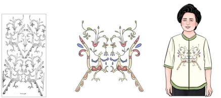 凤鸟是楚人的心之构象,是楚人对美好未来的憧憬。凤鸟纹样中充盈着生命乐观的自由之美、内外兼修的阴柔之美、楚民族坚强不屈的力量之美。基于上述总结发现,楚凤鸟纹的形式与内涵符合中老年的审美与需求。因此,在现代美学的基础上,根据服装的流行趋势,运用形式美的规则与法则进行有针对性地再设计。应用方式可分为直接应用与间接应用。