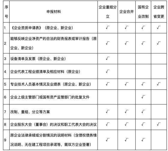 (三)企业发生重组分立、合并、国企改制(含事业单位改制)以及跨省变更的,申请重新核定资质的,需提供以下材料: