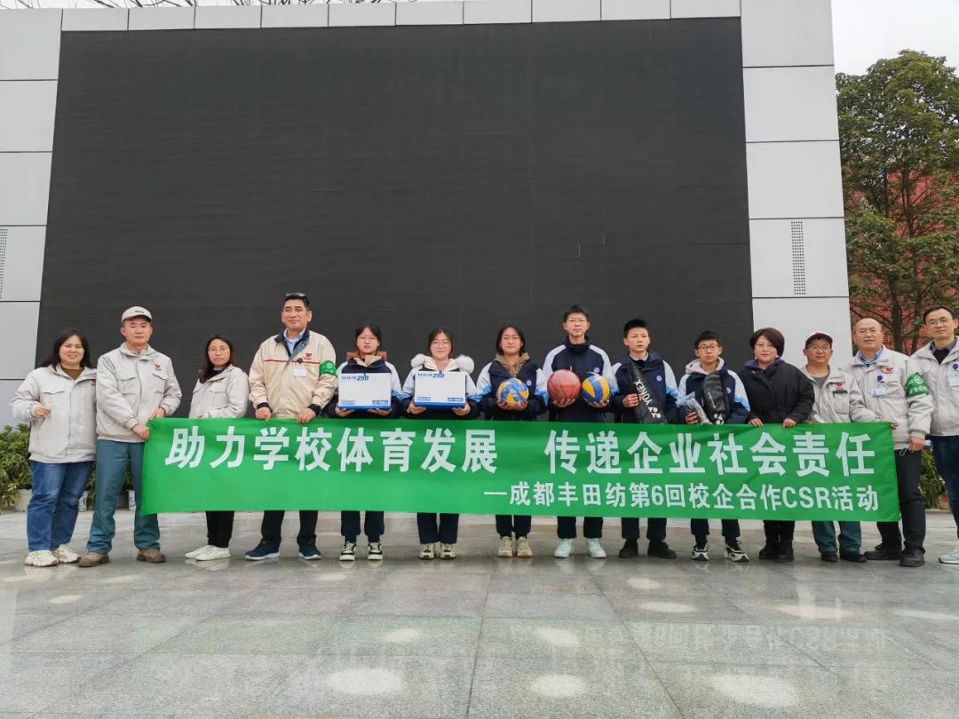为助力学校体育发展,传递企业社会责任,1月19日下午,成都丰田纺渡边总经理一行来到成都经济技术开发区实验中学开展校企共建活动,为学校捐赠了一批体育用品。这是成都丰田纺第6次对学校开展捐赠活动。成都丰田纺一贯注重承担社会责任,注重与所在地学校等组织的交流合作,关心学生一代的教育和成长,今后仍将和成都经济技术开发区实验中学保持更加紧密的交流与合作。