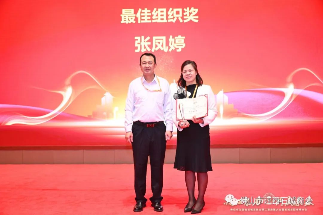 在商会第一届的工作中,秘书处发挥了极其重要的作用,他们践行服务宗旨,组织协调能力强,服务质量优秀,现授予第一届秘书处最佳组织奖,由第一届秘书长张凤婷上台领奖,第二届秘书长曾忠爱上台颁奖,薪火相传,希望下一届秘书处工作再接再厉,更上一层楼!