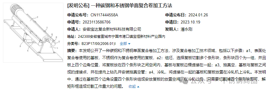1月26日,安徽宝达复合新材料科技有限公司成功申请一项名为“一种碳钢和不锈钢单面复合卷加工方法”专利,申请公布号CN117444558A,申请日期为2023年10月19日。