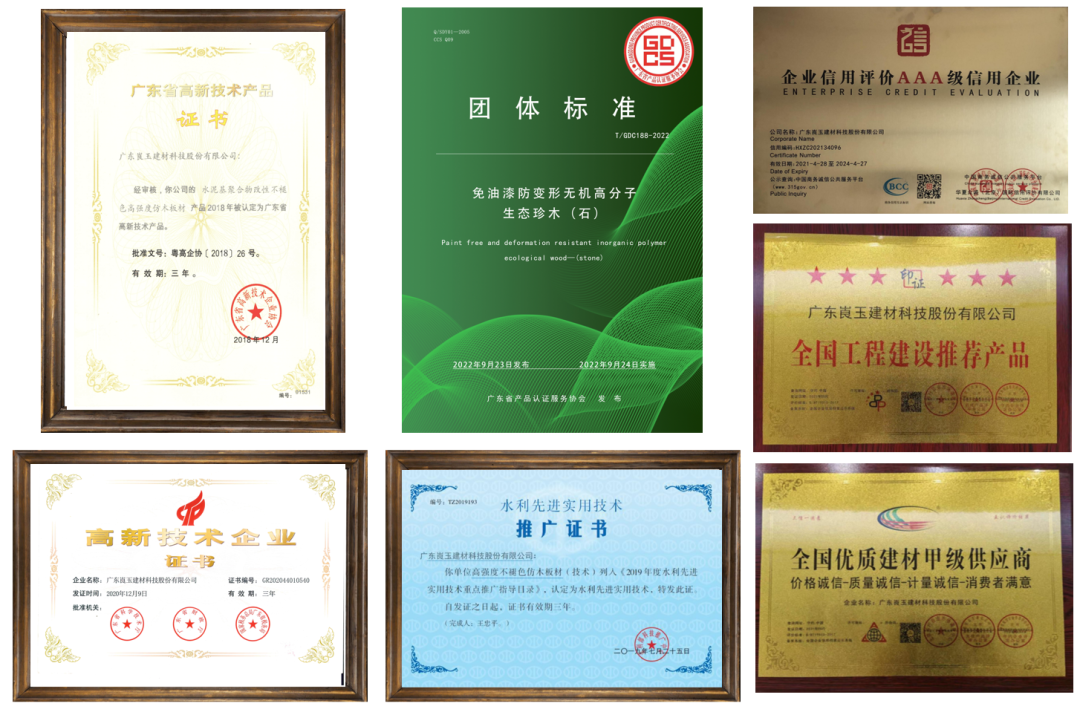 技术是新材料产业的核心驱动力,也是新材料企业竞争力的重要体现。通过多年的努力,崀玉在新材料技术方面取得了一系列创新和突破。据了解,崀玉连续多年被评定为高新技术企业,多项产品技术获得国家发明专利及实用新型专利,同时也是国家水利部认定的先进实用技术重点推广产品,2022年崀玉联合广东省产品认证服务协会等众多起草单位,发布了《免油漆防变形无机高分子生态珍木(石)》的团体标准。