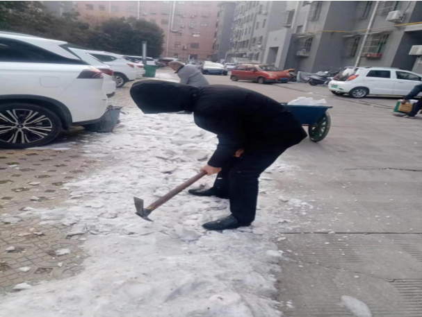城市嘉园小区物业工作人员对小区公共区域残留冰雪进行清理。