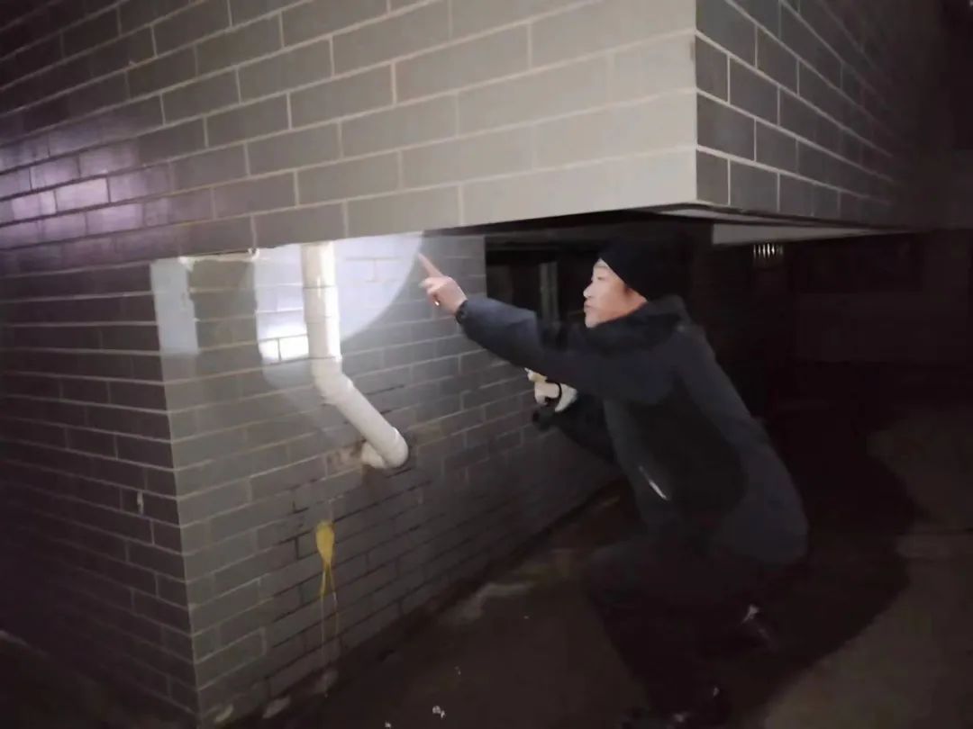 城市嘉园小区物业工作人员对楼栋下水管漏水问题进行检修。