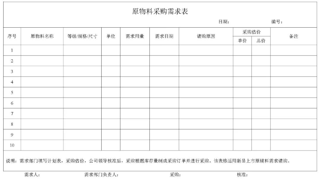 | 43、委托出厂检验登记表 | 94、原物料采购需求表 |