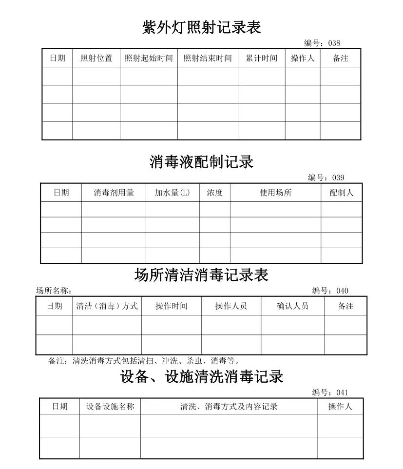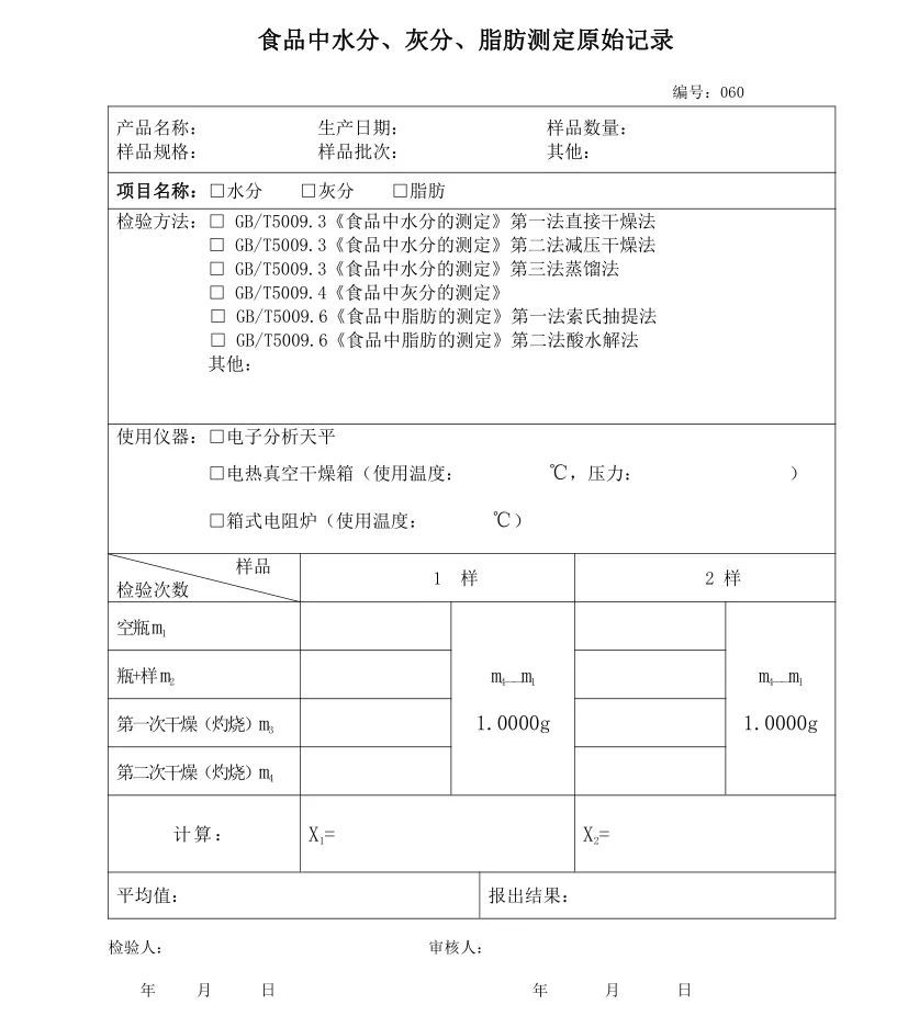 | 40、场所清洁消毒记录表 | 91、食品中水分、灰分、脂肪测定原始记录 |