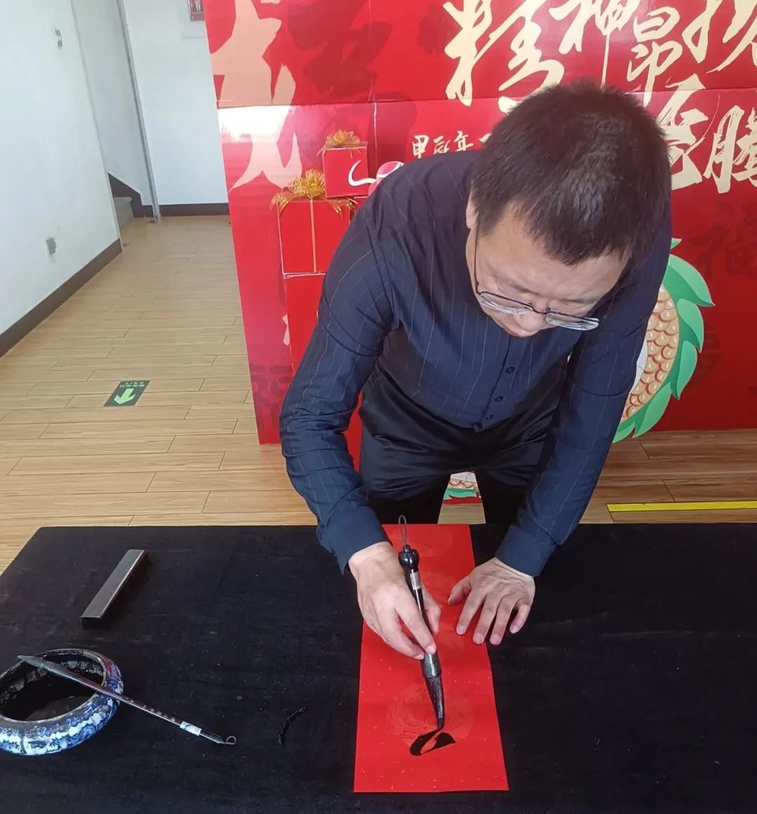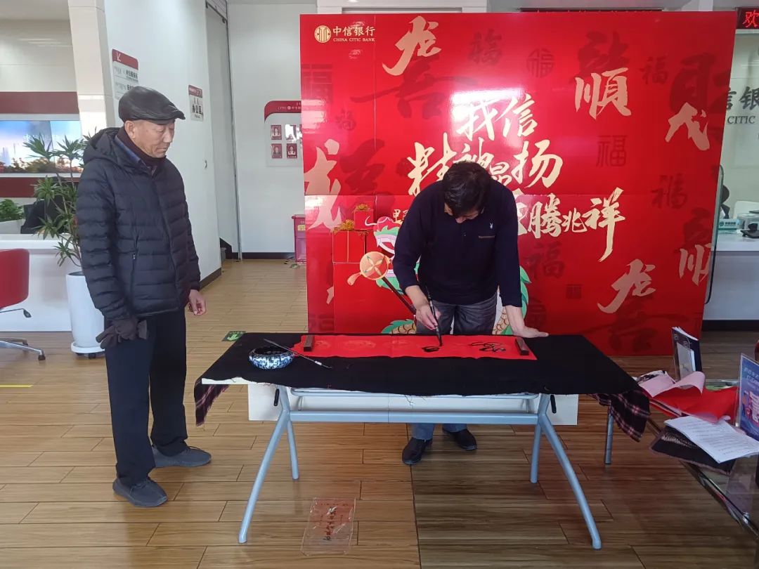 妙笔生花颂祥瑞,翰墨留香迎新春。“迎新春、贴春联”是中华民族的传统文化,为弘扬中华传统,喜迎龙年新春,让新年更有年味儿,1月26日上午,赤峰企业文化协会、赤峰兰亭书画院走进中信银行松山支行开展“迎新春,写春联,送祝福”活动。赤峰企业文化协会会长、赤峰兰亭书画院院长张治国,赤峰兰亭书画院院士张亚君现场书写春联,为中信银行松山支行广大客户及群众送去新春最诚挚的祝福。