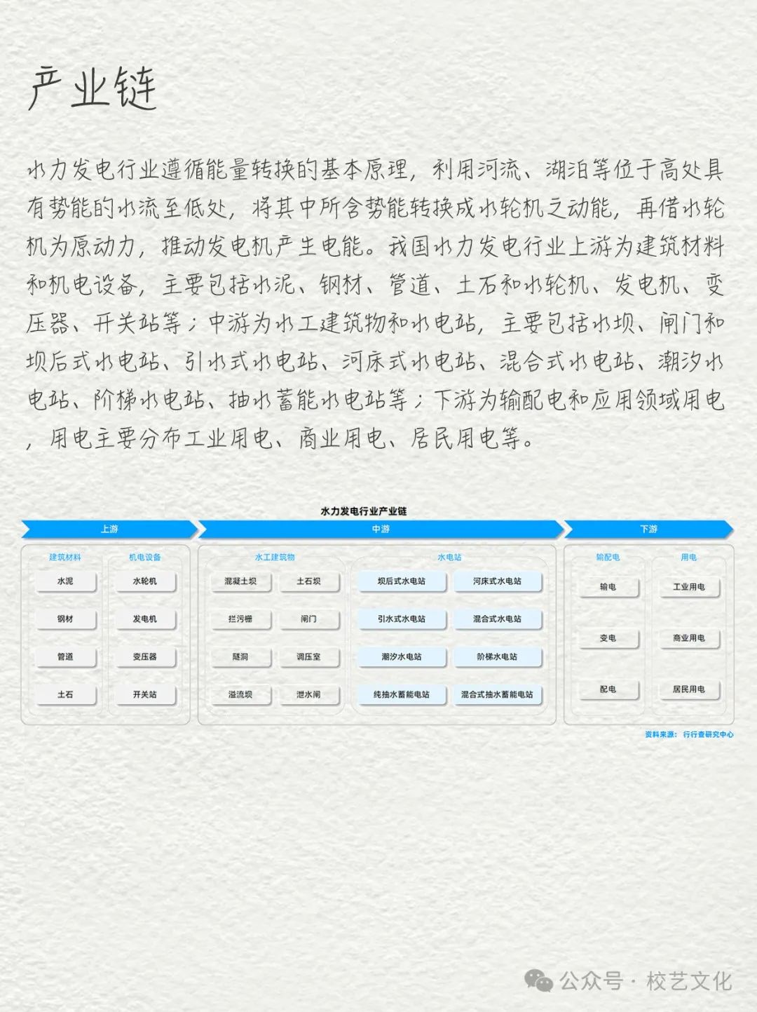 1.上下游产业链关联产业:水电产业上游主要包括水资源勘察、规划设计等;下游主要包括电力输配、用电设备等。