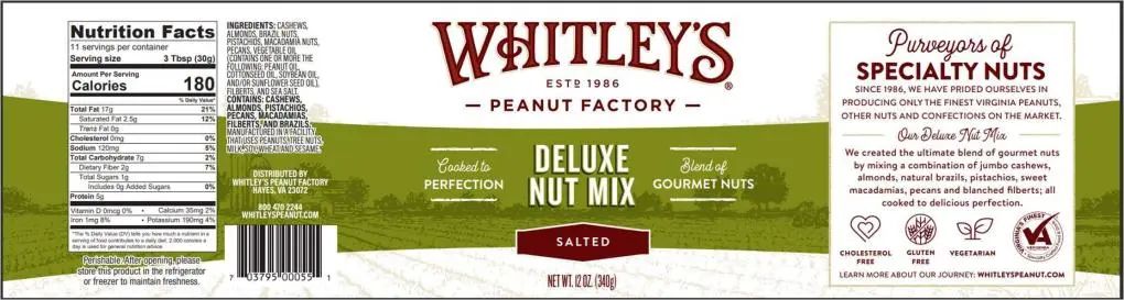弗吉尼亚州的Whitley’s Peanut Factory正在召回带有特定代码日期的12盎司豪华坚果MIX,因为它们可能含有未申报的花生、牛奶、大豆、小麦和芝麻。