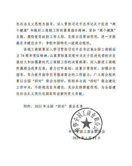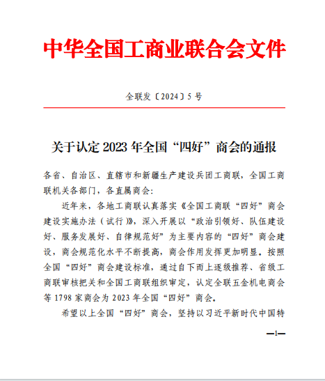 2024年1月26日中华全国工商业联合会印发全国“四好”商会通报,广安市汽车行业商会被评为全国“四好”商会。