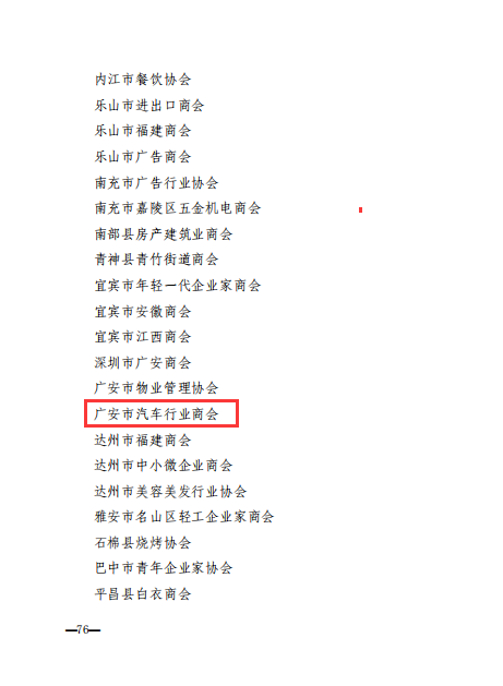 为深入贯彻落实《关于促进工商联所属商会改革和发展的实施意见》精神、扎实推进“四好”商会建设,根据全国工商联《关于开展2023年全国“四好”商会认定工作的通知》。通过广安市工商联推荐,四川省工商联审核、全国工商联组织评审,经全国工商联主席办公会议审核通过。广安市汽车行业商会名列其中,喜获殊荣。