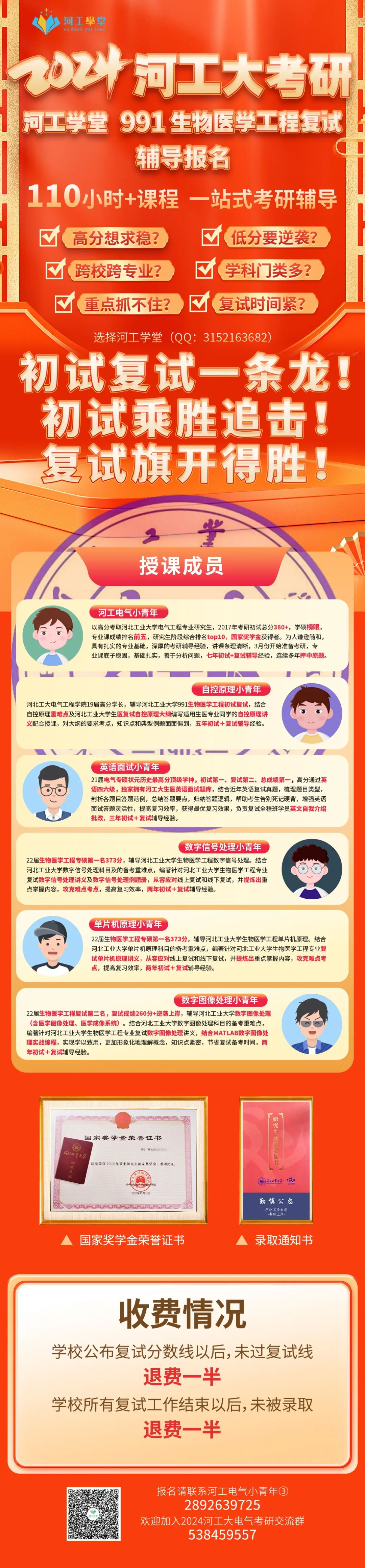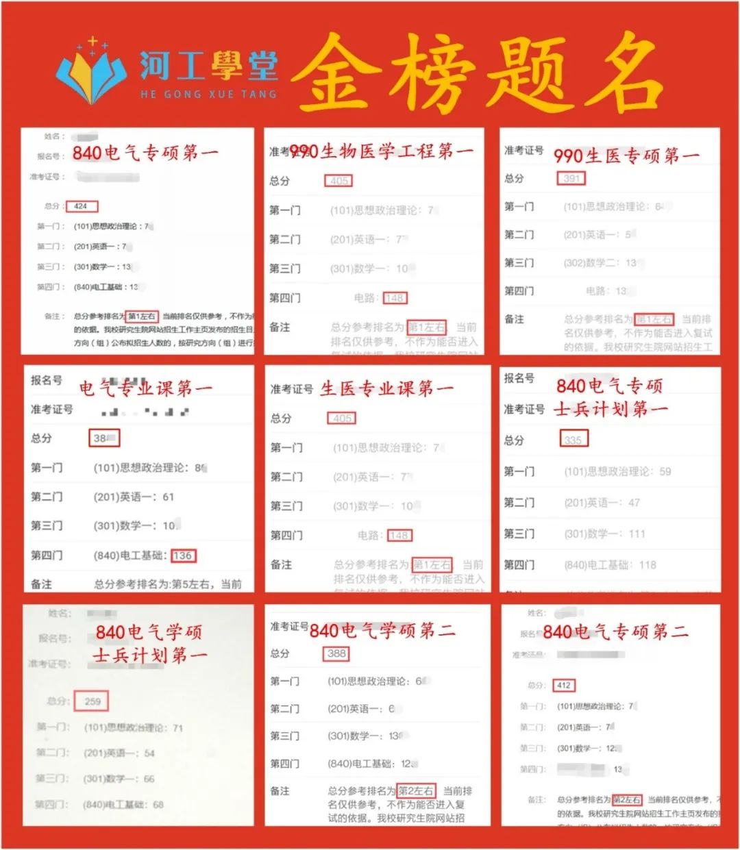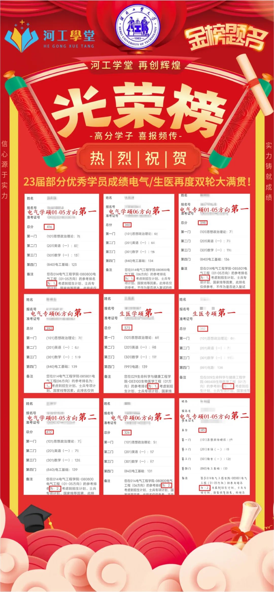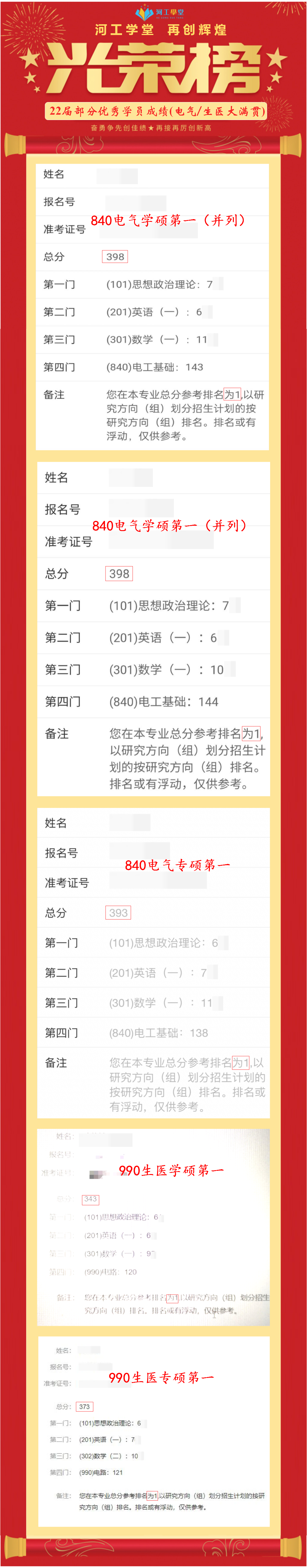 840电气专硕电气工程状元424分、990生物医学工程学硕生物医学工程状元405分均出自河工电气小青年全程班。