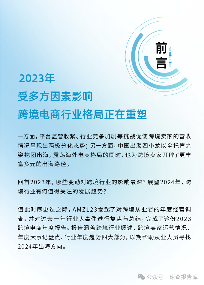 值此时序更迭之际,AMZ123发起了对跨境从业者的年度经营调查,并对过去一年行业大事件进行复盘与总结,完成了这份2023跨境电商年度报告。报告涵盖跨境行业概述、跨境卖家运营情况年度大事记盘点、行业年度趋势四大部分,以期帮助从业人员寻找2024年出海方向。
