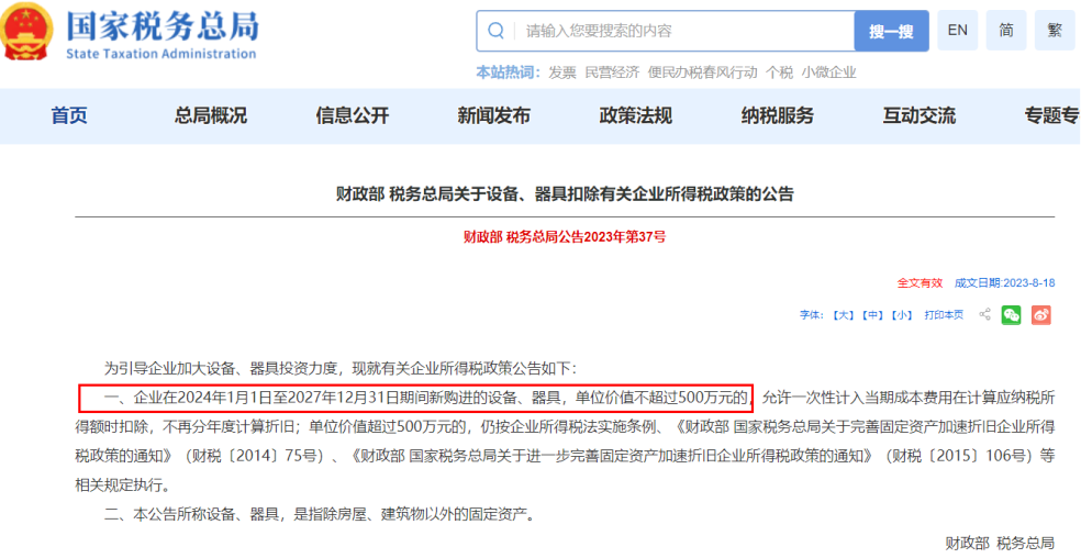 一、500万以下新购进设备、器具一次性扣除