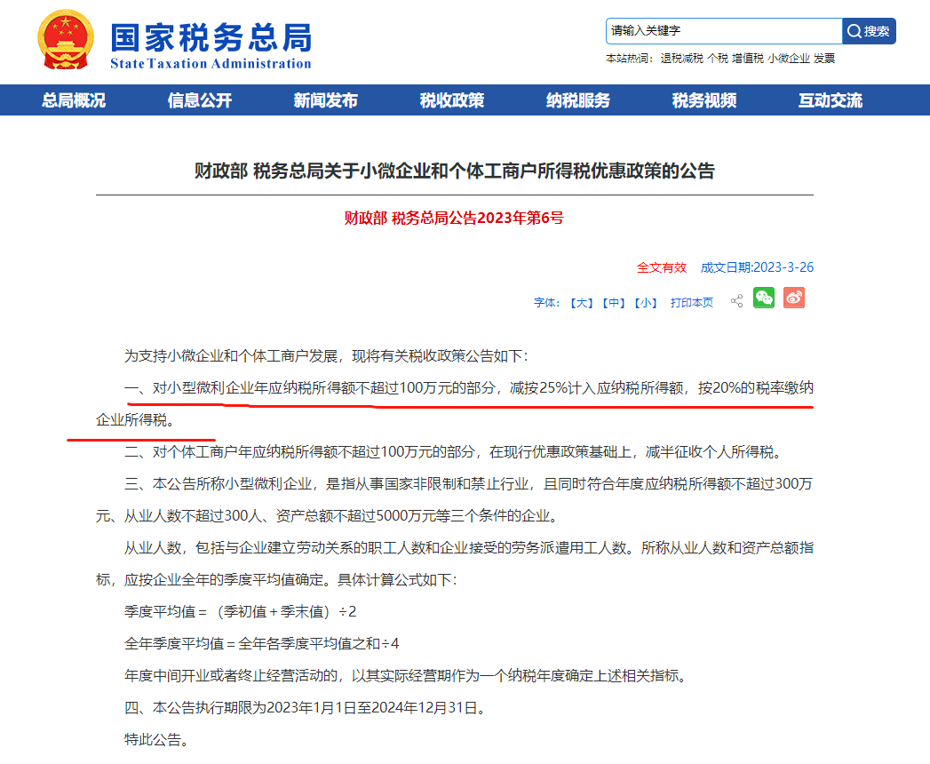小型微利企业:对小型微利企业年应纳税所得额不超过100万元的部分,减按25%计入应纳税所得额,按20%税率缴纳企业所得税(财政部 税务总局公告2023年第6号)