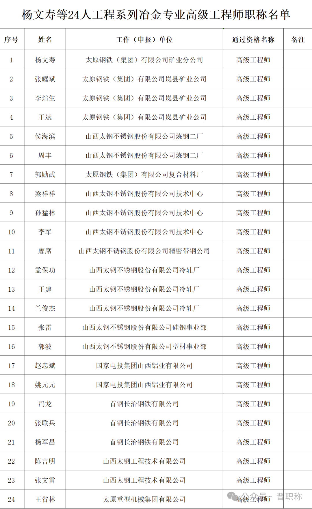 关于公布杨文寿等24人工程系列冶金专业高级工程师