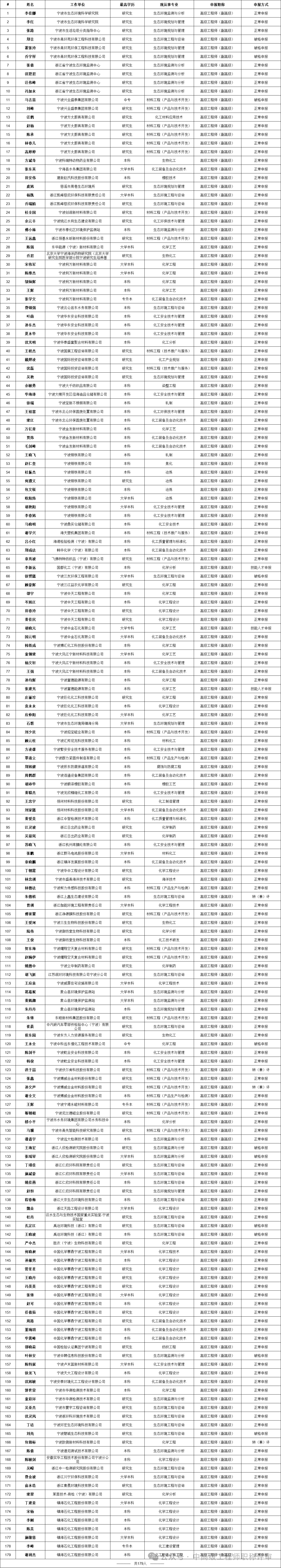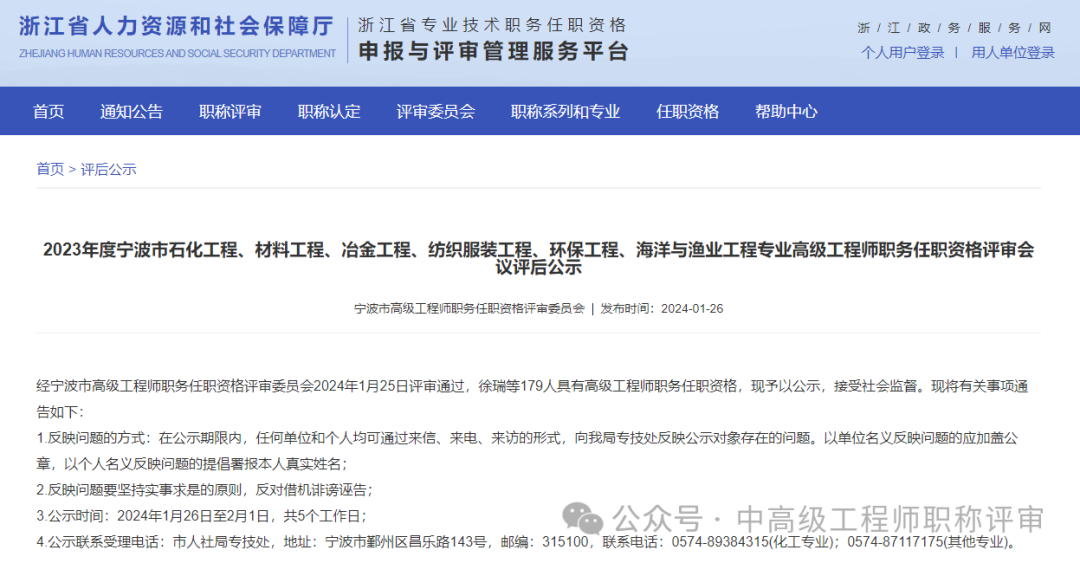 2024年1月26日宁波市高级工程师职务任职资格评审委员会发布了《2023年度宁波市石化工程、材料工程、冶金工程、纺织服装工程、环保工程、海洋与渔业工程专业高级工程师职务任职资格评审会议评后公示》共有179人通过!