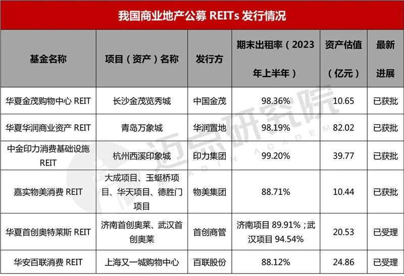 2023年,商业地产行业迎来首批消费基础设施REITs。2023年年底,首批4支消费基础设施REITs产品获批。发行方华润、金茂、印力、物美,均为我国头部消费基础设施领域的参与者。首创商管、百联股份亦分别有REITs获得交易所受理。